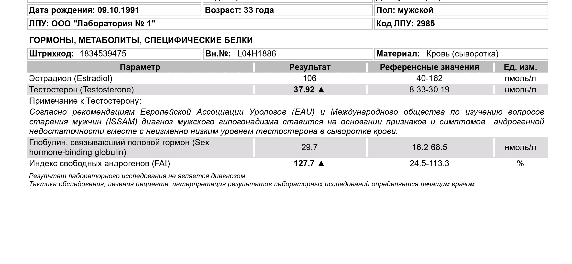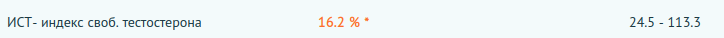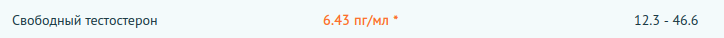 >>1646772 Про ГСПГ ты все точно про рефы все неверно понял... Там референты указаны для мужчин в целом, а не для 25 летнего!!! У тебя он не должен превышать 30, а в целом, он должен быть тождествен возрасту, т.е. вангую твои проблемы в 90% связаны с гспг. Анализы по тесту в пол года у тебя не о чем. Сдай сейчас тест общий, гспг, пролактин до кучи и неси сюда. И никогда не сдавай анализ на свободный тест. Это прогрев для глупых гоев... Только общий и гспг, а далее считай сам по формуле: (Общий тестостерон / ГСПГ) × 100%. А в cmd даже, внезапно, его бесплатно вычитают при сдаче общего и гспг (пример прилагаю). Ты вообще сколько раз гспг сдавал? Есть ли динамика по гспг или он всегда зашкаливает? Проблемы с эрекцией и либидо давно начались?