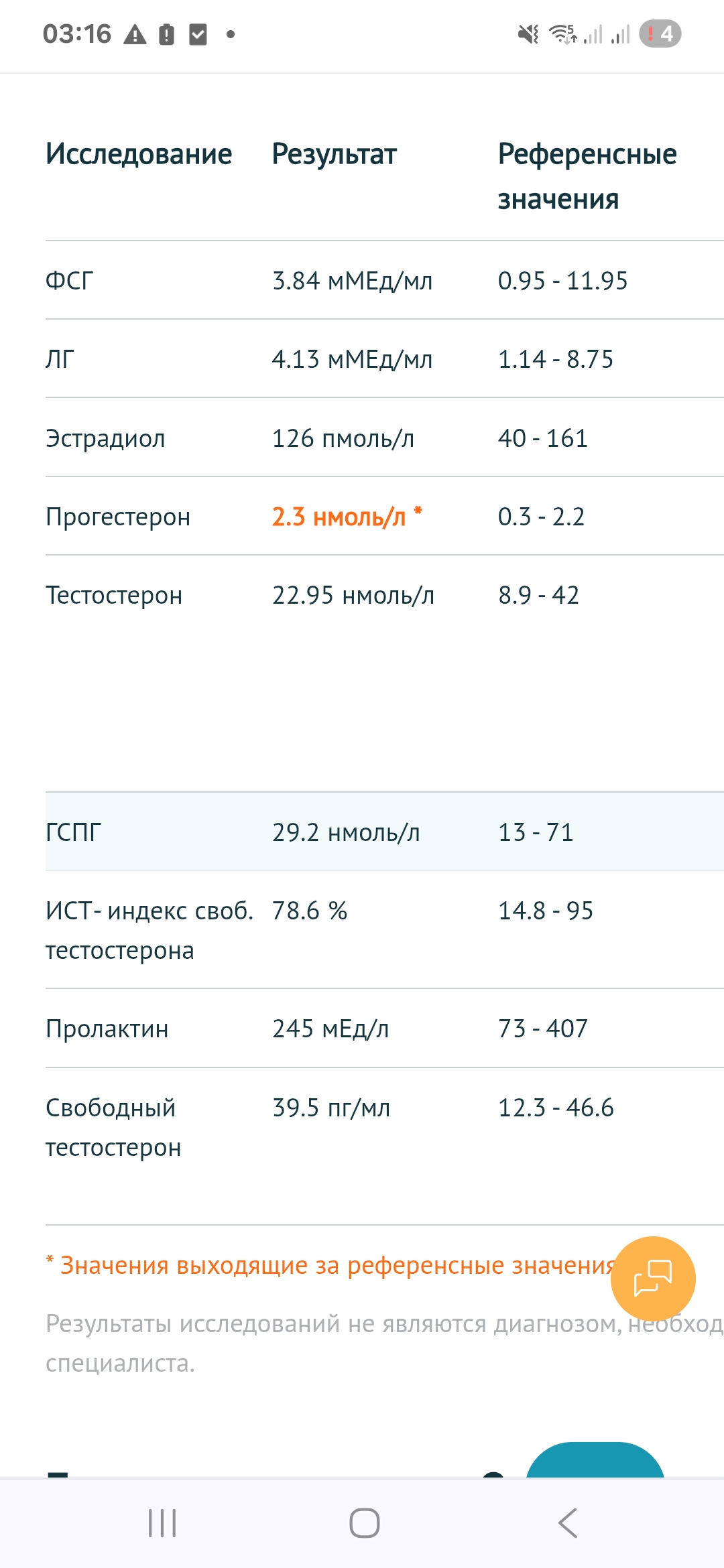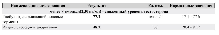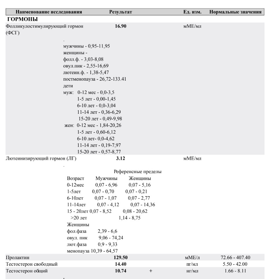 Анализы хорошие: ЛГ, ФСГ, Пролактин, общий и свободный тестостерон идеальные, только ГСПГ чуть повышен: >> ГСПГ 69.40 нмоль/л (18.00 - 53.40)