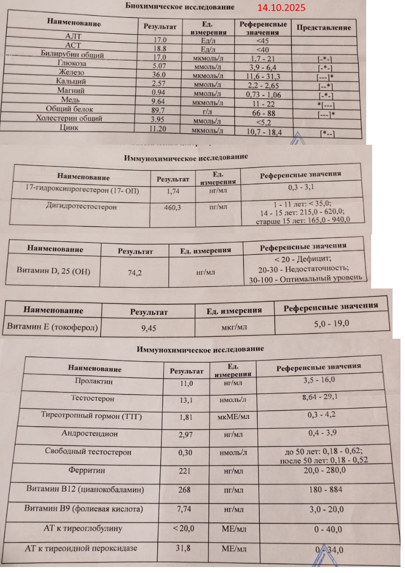 Потом ебнула депрессия. С нихуя, просто пришла. Суицидальные мысли, головокружения регулярные, бедроттинг как норма жизни. 1.5 года ебатни, вышел на венлафаксин 150мг. ЭД тогда приоритетом не была, т.к. все равно на таблетках. Спустя время (полгода-год) нашли ебучий гипотиреоз (первичный), ТТГ был такой, что я даже в интернете таких огромных цифр (в развы выше верхней границы) не видел. L-тироксин 100мкг и уже через месяц все пришло в норму. Депрессия как будто немного тоже попустилась, решили с психиатром снижать Венлафаксин, смотреть, что будет. Полет нормальный. Где-то между всей этой хуетой умудрился выцепить новую тян. По сути, выбрал её скорее головой, т.к. тело не оосбо работает при всех описанных выше приколах. (спустя год расстался) Ебли естессно не было, но эндокринолог говорила что тестостерон немного понижен (был близок к нижней границе), надо сбросить вес и он придет в норму и вообще все будет заебись. Вес сбросил (тирзепатид), с 110 до 90. Тестостерон обрушился нахуй, прорвал днище (первые два скрина с анализами), плюс фсг и лг в динамике тоже упали с прошлых анализов (прошло месяца 4). Пролактин тоже немного повышен, но как мне сказали, такое бывает на венлафаксине. Назначали ХГЧ (500 два раза в неделю, на пару месяцев потом смотрим). Параллельно решил сходить ещё к урологу и другому эндокринологу. Неделя ежедневной ебли в больницах, результат на двух последних скринах. Какая нахуй гипоплазия?! Как эту хуйню раньше не раскопали?