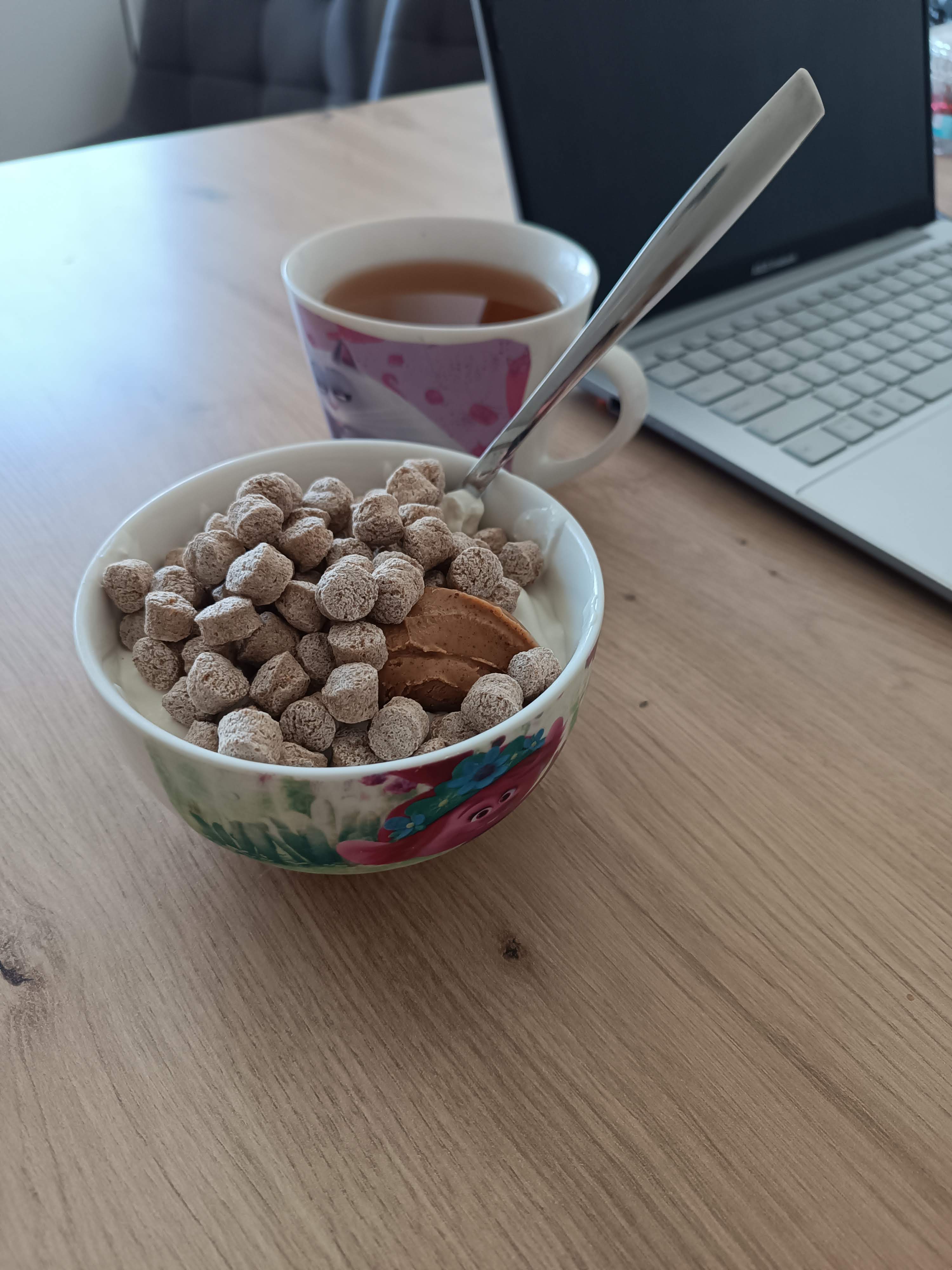 Зацените хавчик: 100 грамм творога 2% Простоквашино, 150 грамм сметаны Пискаревская 15%, жменя хрустящих отрубей от Юли В., которая готовить не умеет, коричневое - это не говно, а грамм 20-30 орахисовой пасты, чаек (четвертая кружка правда уже с утра).