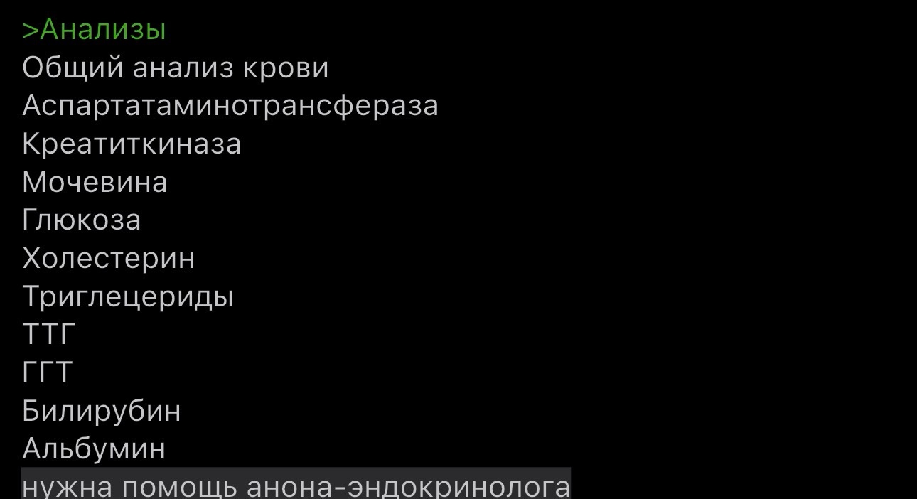 >Анализы Общий анализ крови Аспартатаминотрансфераза Креатиткиназа Мочевина Глюкоза Холестерин Триглецериды ТТГ ГГТ Билирубин Альбумин нужна помощь анона-эндокринолога