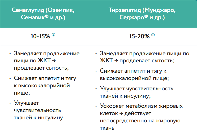 >Чем отличается вещество семаглутид (оземпик) от тирзепатида (монжаро)? сематлутид - снижение ~10-15% от веса тирзепатид - снижение ~20-25% от веса, 2 поколение специально для похудения данные за 16 месяцев