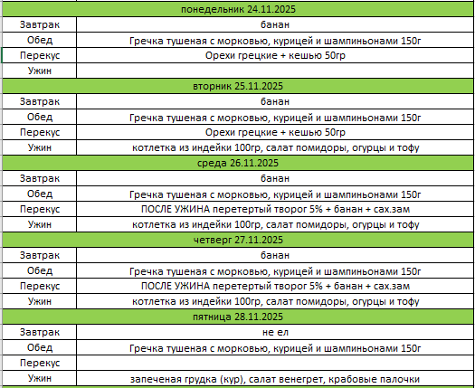 >>1641372 Можете назвать шизом но я вернулся. Исходные данные: 45 лвл, 25.08 - 102 кг при росте 172, набрал с 85 кг за последние два года, лесополосил по тяжелой. Ставлюсь с 28.08 по 0,25 мг, уже пять раз получается. С 01.09 - не бухаю. Побочек не ощущаю. Первое время ел один раз в сутки, сам охуел от того что есть не хочется. То есть проснулся, три раза чаю попил, смотришь а уже обед, в 14-15 часов - наебнул фалафель на тарелке, вечером могу полпачки (сто граб) творога, полбанки сметаны, и спать. Иногда творог, сметаны, пару ложек льняной каши (нашел в закромах, ем чтобы не пропадала), шариков отрубей жменю могу кинуть, похрустеть. На вкус говно, но веть такое и надо. Мучное, сахар/сладкое исключил. Добавил физкультуры: утром 20 минут обычная зарядка, растяжка, 10 отжиманий, 10 приседаний, один или два подхода на элипсе по 10 минут пока сериальчик смотрю на щадящей скорости. Забил себе в треккер превычек норму в 100 отжиманий и 100 приседаний в день, постепенно наращиваю и планирую норму выполнять. Засматриваюсь на гирю в 16 кг, хочу добавить жим, рывок, приседания в крайне малых количествах. Сейчас стараюсь есть два раза в день, упор на овощи, молочку: творог, сметана, кифир, мясо. Могу закинуться протеиновым коктейлем или ложкой арахисовой пасты. Сегодня в обед был 0,5 снежка, вечером доел салатик их капусты с огурцами и ложусь спать.