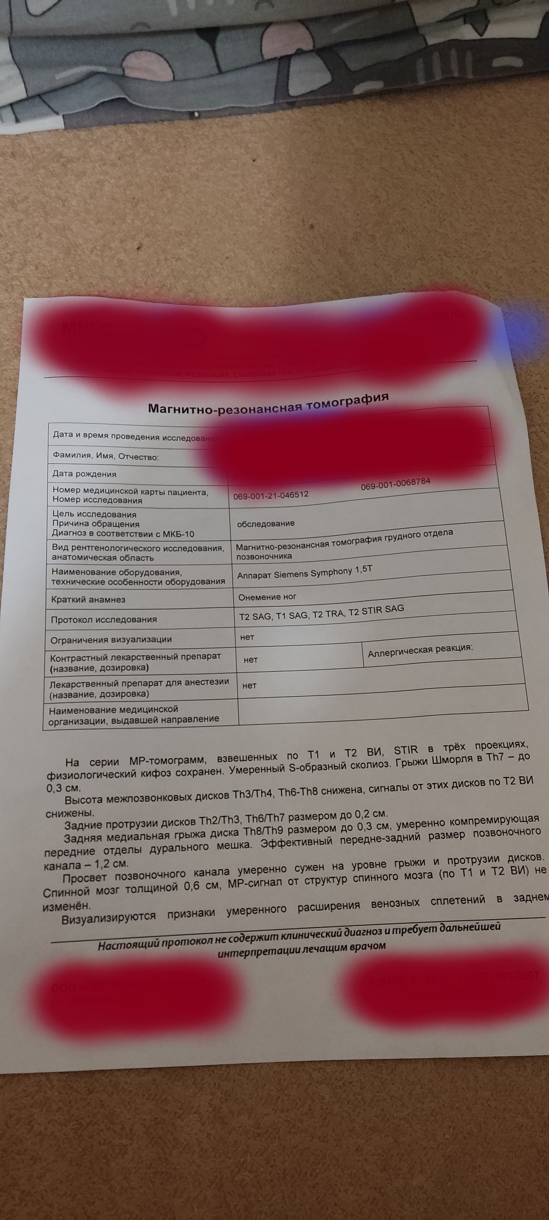 Заключение: Дистрофические изменения грудного отдела позвоночника. Протрузии дисков Th6-Th9. Спондилез. Спондилоартроз.