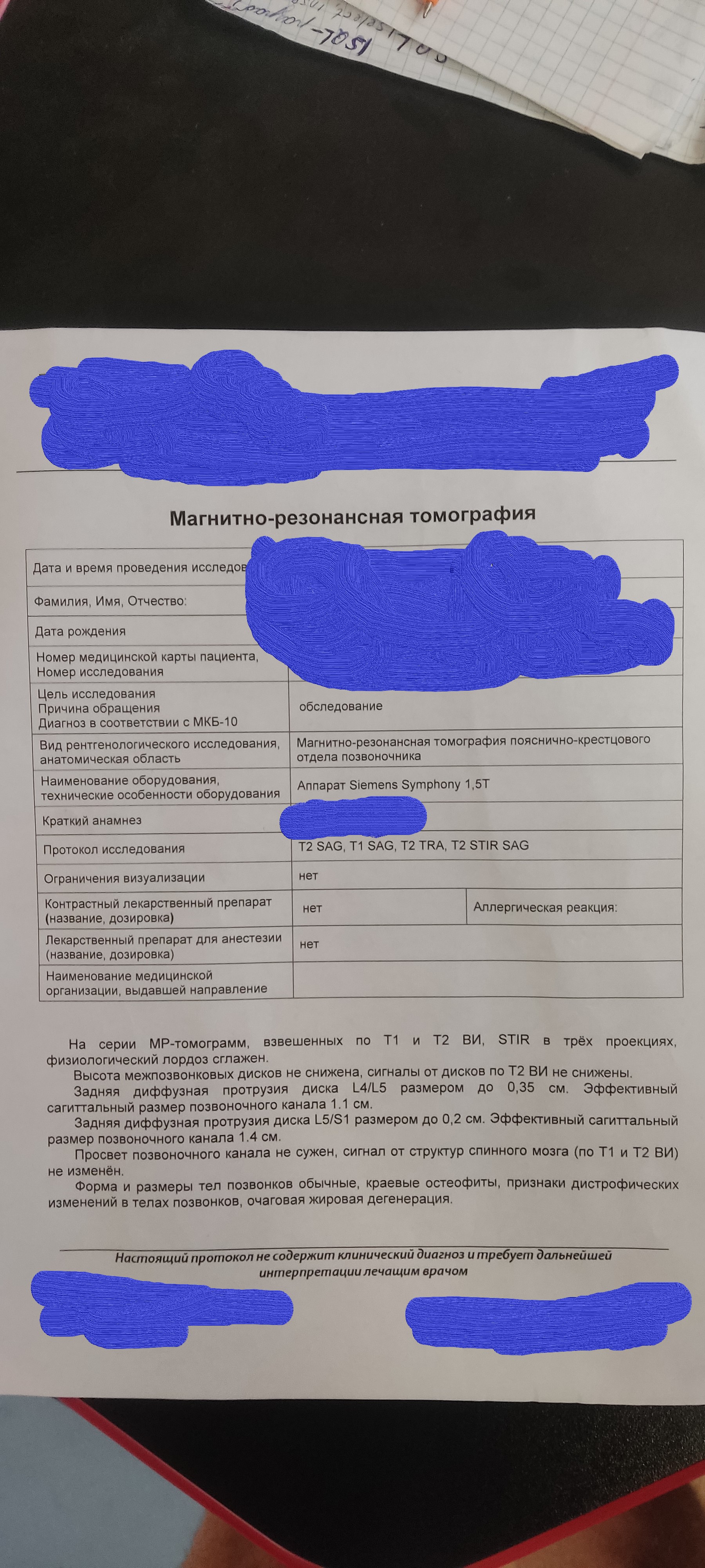 Заключение: МР картина дегенеративно-дистрофических изменений пояснично- крестцового отдела позвоночника. Протрузия диска L5/S1. Спондилоартроз.медиальная по типу протрузии диска L5/S1, размером 0,45 см, с сужением межпозвонковых отверстий.