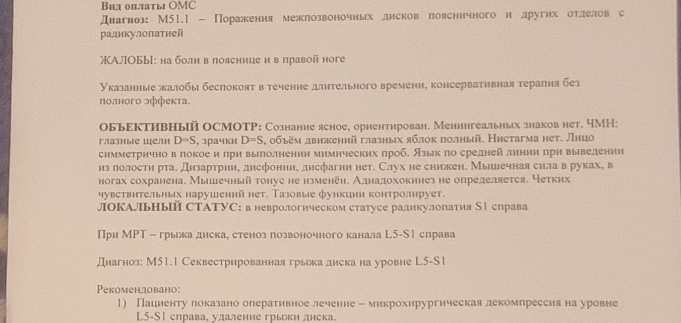 Сходил к неврологу и нейрохирургу по ОМС. Рекомендуют операцию, блин. Но невролог говорит, что "неизвестно, как грыжа себя поведёт; может, что засохнет". Вроде как раз 2 месяца назад фиброзное кольцо порвалось, поэтому грыжа до 12 мм. продвинулась.