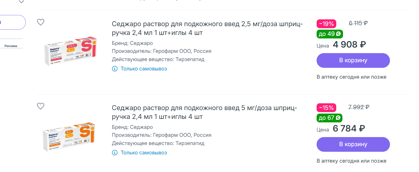 >Понял, что покупать то, хочу прямо сейчас Семавик(некст)/Квинсента (семаглутид) - 0.25мг доза первый месяц Седжаро/Тирзетта (тирзепатид) - 2.5мг/доза первый месяц Колоть каждую неделю в живот отступая мизинец от пупка (не руки/не ноги, хуже усваиваемость)