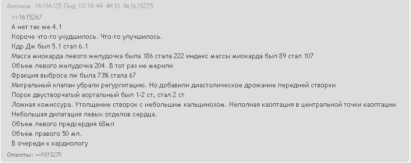 Привет всем. Я тот анон 23 с аневризмой и т.д. который качается. Подходит год с момента прошлого обследования. На след. неделе иду к кардиологу на проверку, там меня в очередь на ЭХО кинет, и через 2-3 недели пойду на узи. Я перестал качаться, т.к. времени не хватает, я в вуз поступил. Получается, в апреле 2025 сделали ЭХО. До августа качался активно, в августе реже. С сентября забросил.. Думаю скоро продолжить, но редко. Начал пить энергетики иногда, чтоб бодреньким на парах быть. Ну и недосыпы появились, хз как влияет. +Лишний вес появился. Был 185/85, сейчас где-то 100кг Роллим изменение за год Вопросы: 1. В прошлый раз, узист не нашел кое-что и не было данных по этому. Влияет ли на результат узи растительность на груди? Я волосатый, надо ли брить? 2. Кому назначают спироэргометрия/Велоэргометрия/6 минутный тест? Я могу напроситься у кардиолога на направление на что-то из этого? Или пошлет к частнику, или скажет мне это не нужно?