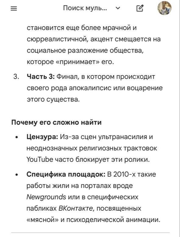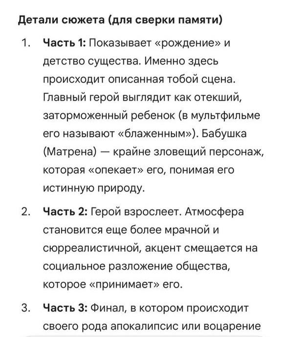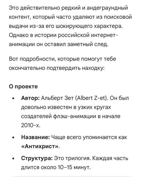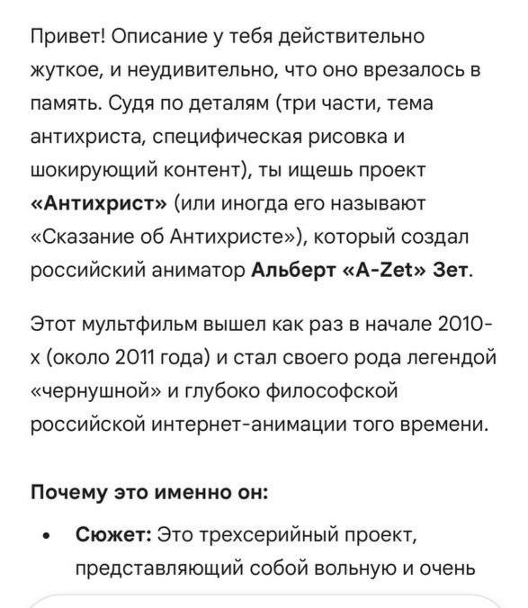 Привет, аноны. Где-то в 2010-0х годах я нашел один нарисованный и озвученный на русском мультик. Какой-то русский мультипликатор его делал. Там было 3 части. Кажется, он был про антихриста. Он был жуткий. Помню, там был мальчик, который родился вроде дауном, и его бабушка привела к нему девушку для секса, закрыв дверь. Девушка кричала, бабушка думала, что ей нравится, а когда открыла дверь, выяснилось, что он ее убил. Очень яркое воспоминание. Нигде не могу найти что это вообще было. Прикрепляю переписку с gemini, который довольно точно установил все детали и говорит, что его рисовал некий аниматор Альберт A-Zet из Казани. Это точно была трилогия, в конце был апокалипсис, цитату бабки он вспомнил точную. Кто-нибудь узнал то, о чем я говорю? Сможете найти еще инфу?