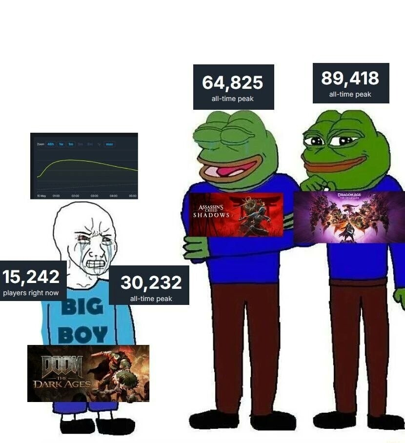 А вот с нового дума наоборот все соевички 40-50 летние в восторге, хули навалили кринжа в арена шутер, как в любимом квейк 3 же, постоянная беготня, беги и бей или сдохнешь! вот это гейлпей блять.