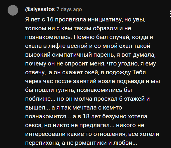>>1050066 Как-то на ютубе одно видео нашел, где девка ныла мол ей 25 и она ещё девственница, никогда не было отношений, парни ей не интересуются и т.п. Короче досмотрел до середины, а она там заявляет что к ней подкатывали пачками и всякие скуфы, фрики, чмошники, то бишь переводя с женского обычные челы. Выключил нахуй сразу, что она вообще знает о клейме девственности