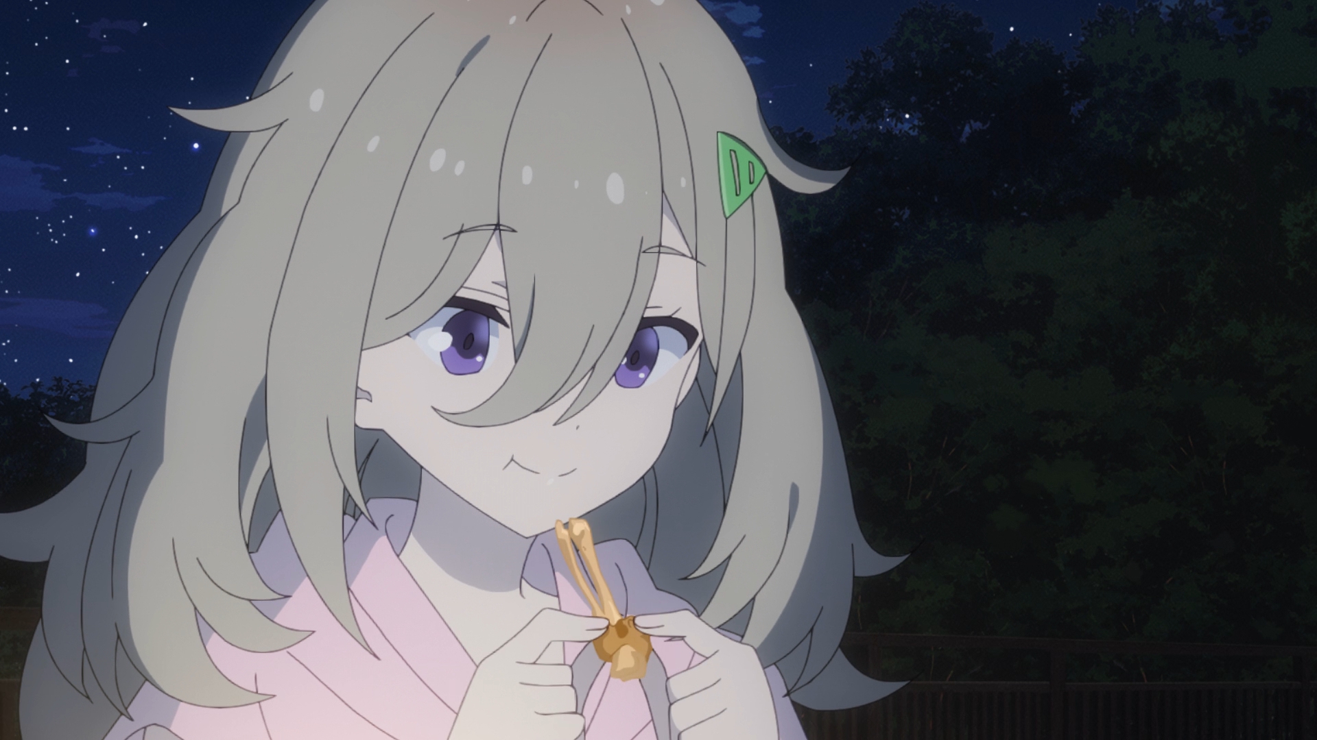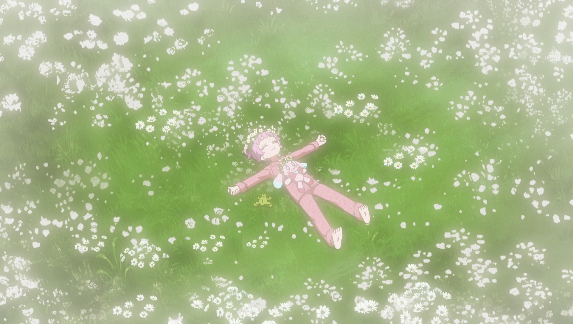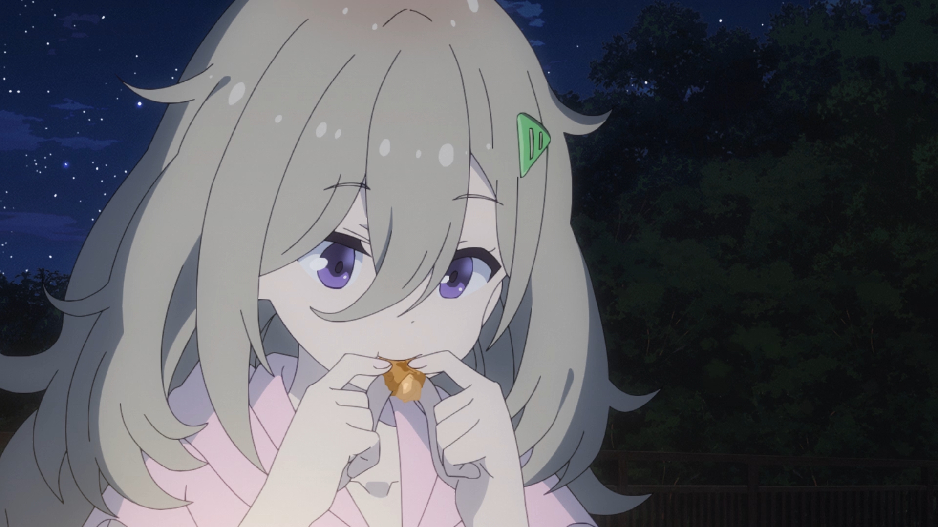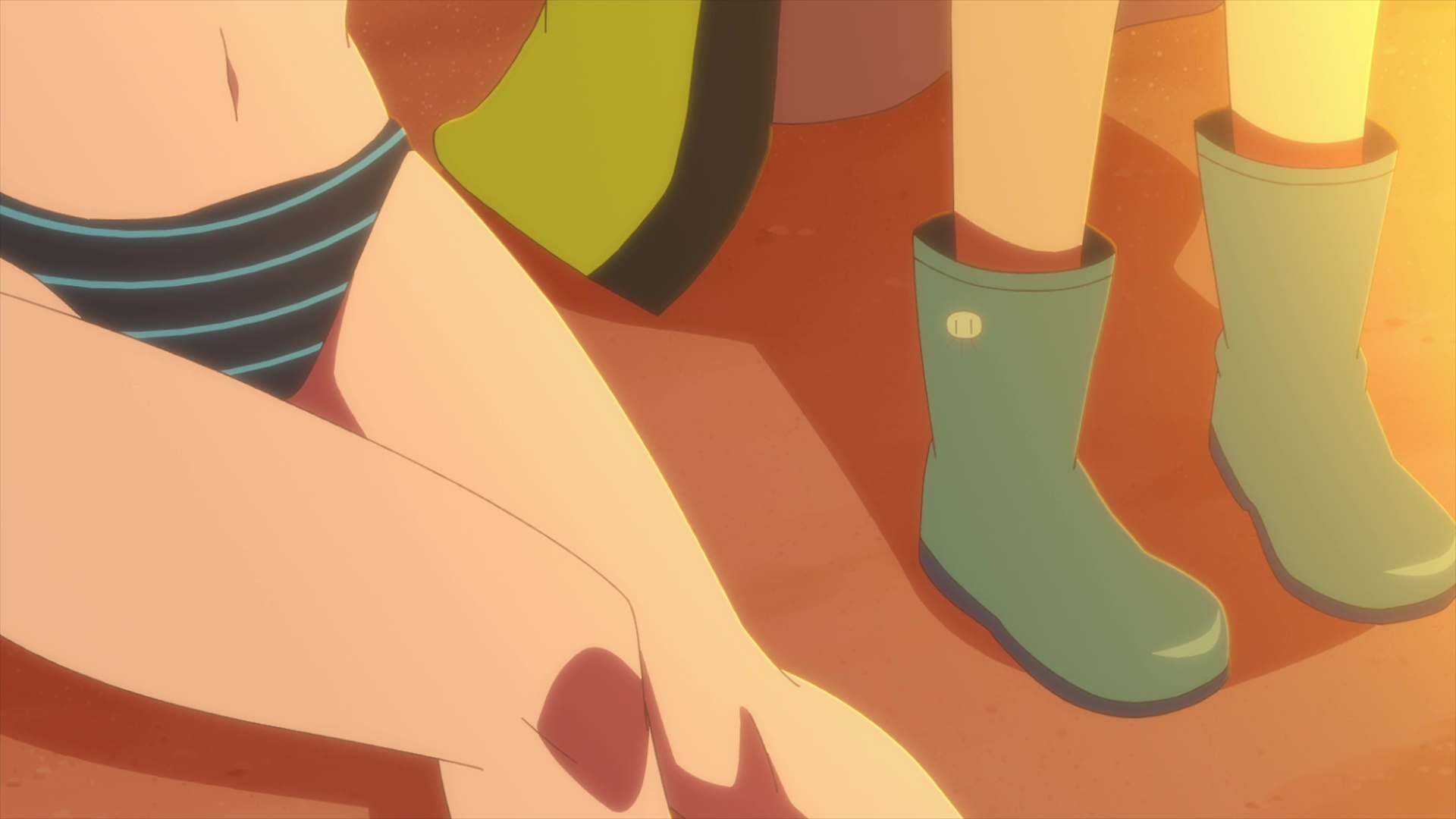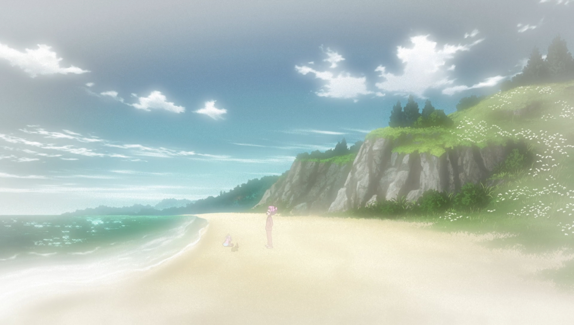 Я понимаю, что вам надо было изобразить больную девочку, и босиком и в ночнушке это общепринятый японский образ, но почему она где-то в ебенях играется, потом с грязными ногами и в соке от травы будет дальше на кровати болеть?