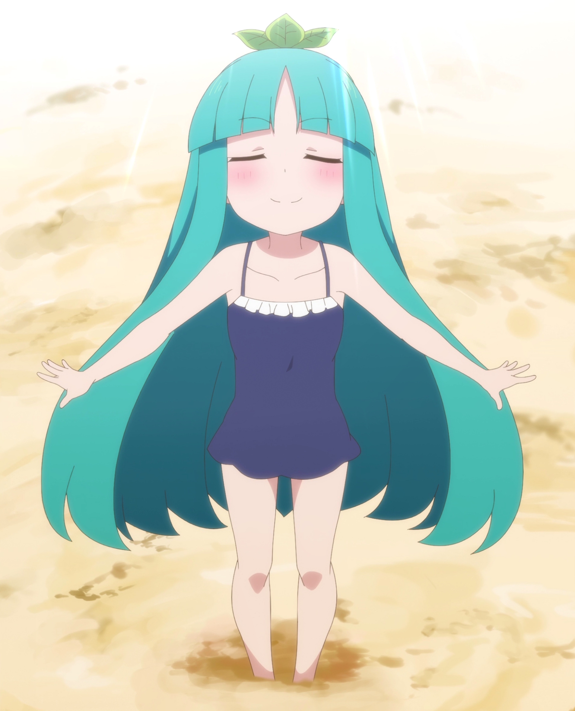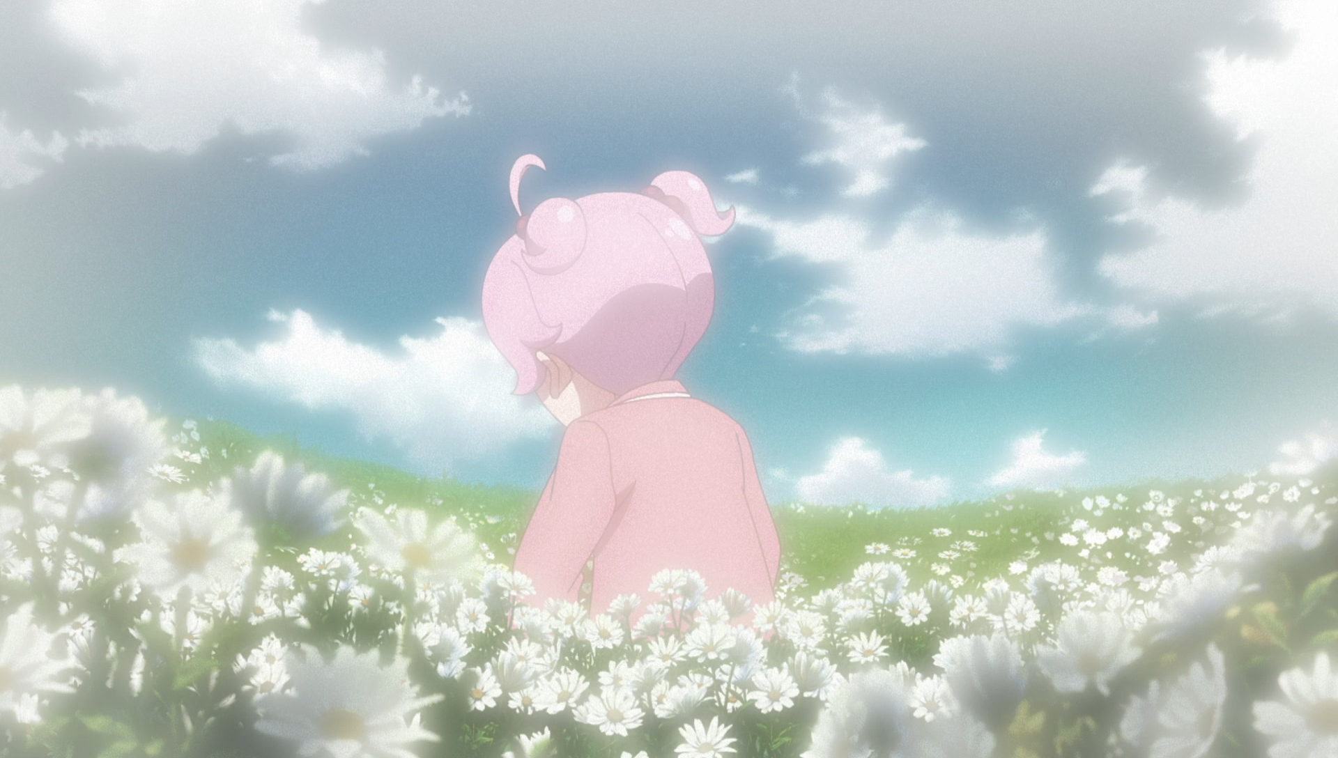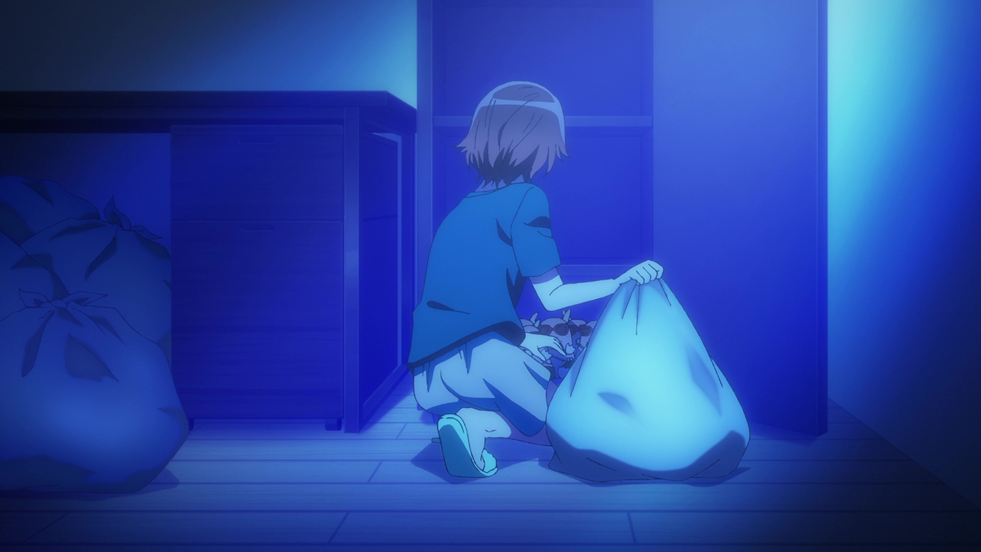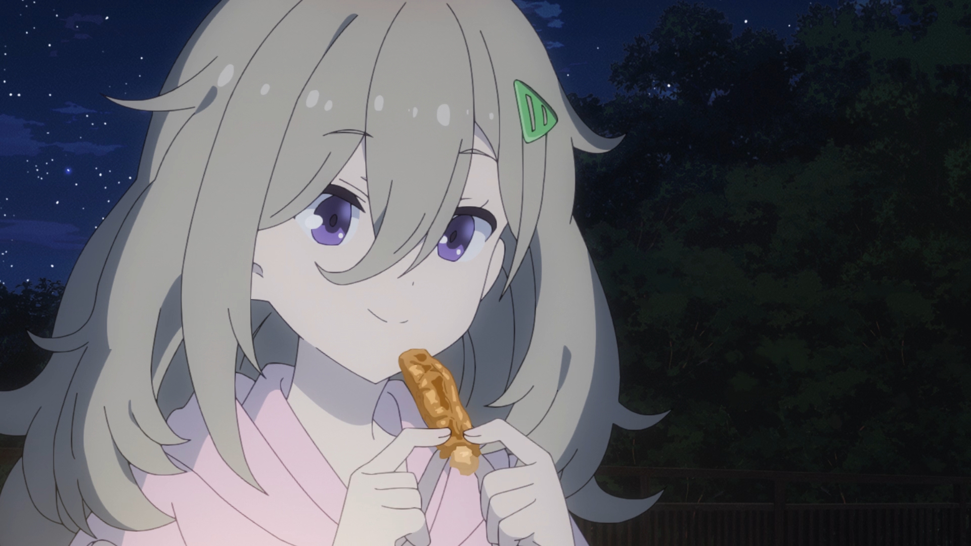 Я понимаю, что вам надо было изобразить больную девочку, и босиком и в ночнушке это общепринятый японский образ, но почему она где-то в ебенях играется, потом с грязными ногами и в соке от травы будет дальше на кровати болеть?