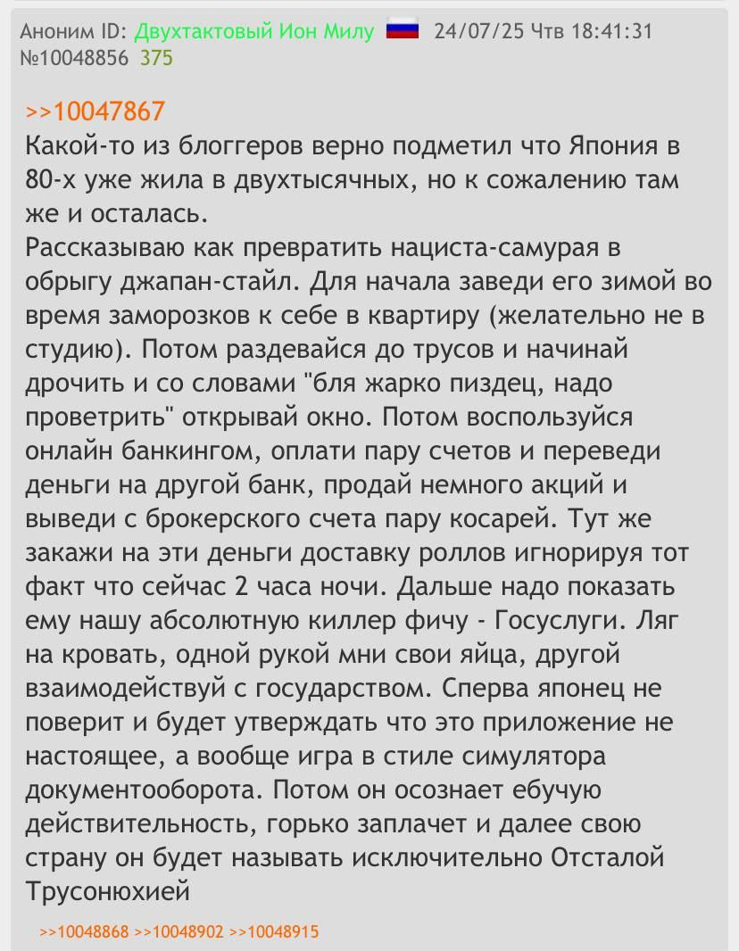 >>1066596 В одном треде на форчке обсуждали это, пришли японцы и сказали, что это пиздеж, не имеющий ничего общего с реальностью, бабы там местами даже хуже натрах.