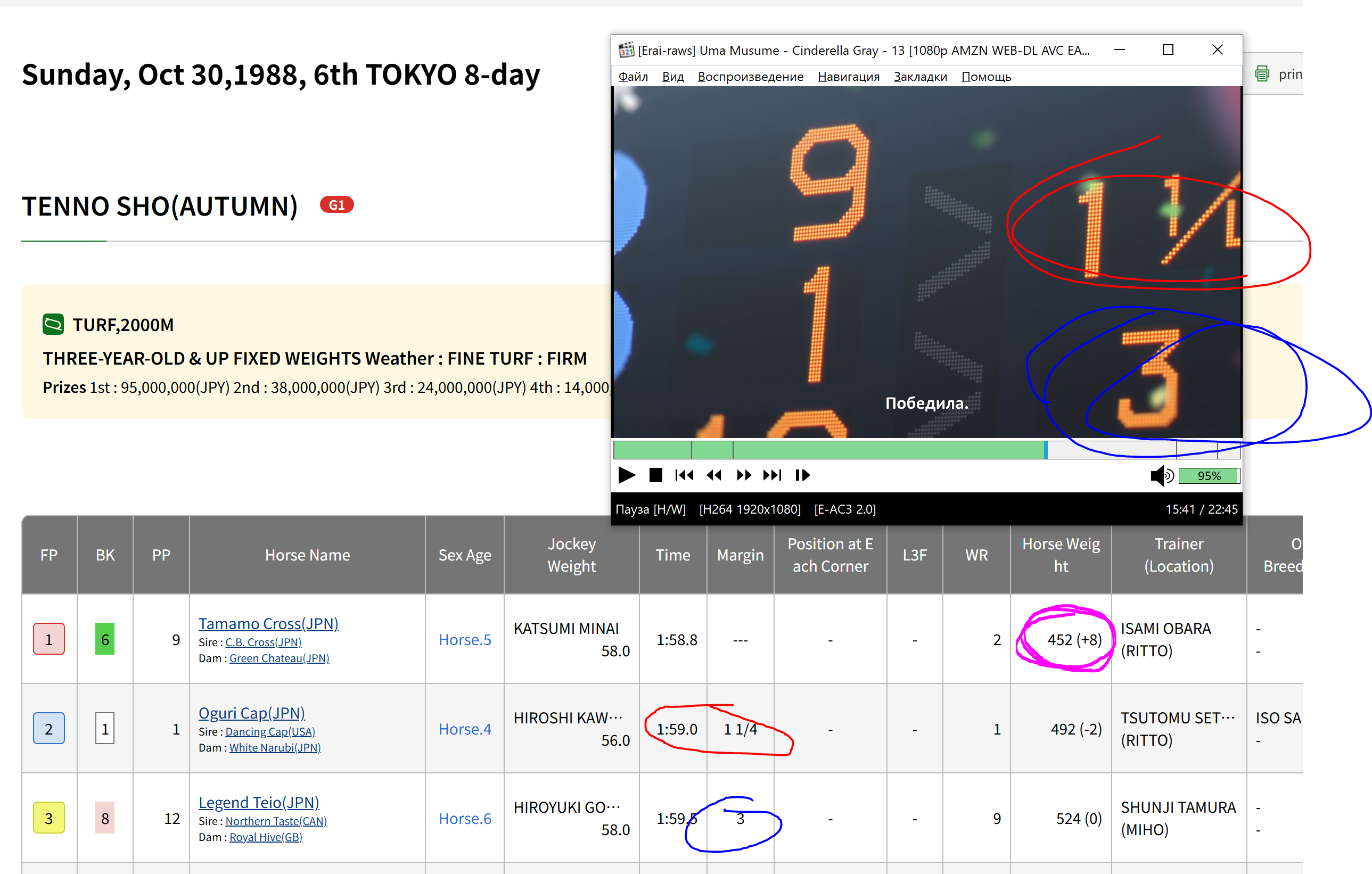ОГУРИ ПРОЕБАЛА ТАМАМО КРОСС В ТЕННО ШО я хотел поругать тайтл, что Оруги всю аниму всех нагибала с первого раза, а на последней гонке как-то неуклюже сдулась НО В 1988 ГОДУ ТАМАМО КРОСС ДЕЙСТВИТЕЛЬНО ПОБЕДИЛА ОГУРИ ВСЁ НАХУЙ НЕ ПОСПОРИШЬ ссука https://www.jbis.jp/race/result/19881030/105/10/