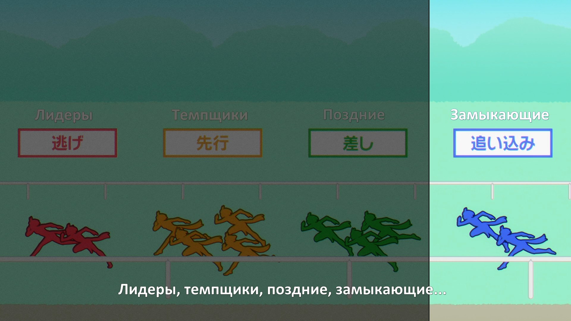 Анима с лошадьми наконец-то стала анимой про спорт — позиционирование на треке, тактика обхода, стратегия забега, внутренние внешние круги, тип и состояние грунта, на котором выполняется забег. Всего этого вообще не было в первом сезоне, там было "Откроются ворота и беги по кругу))".