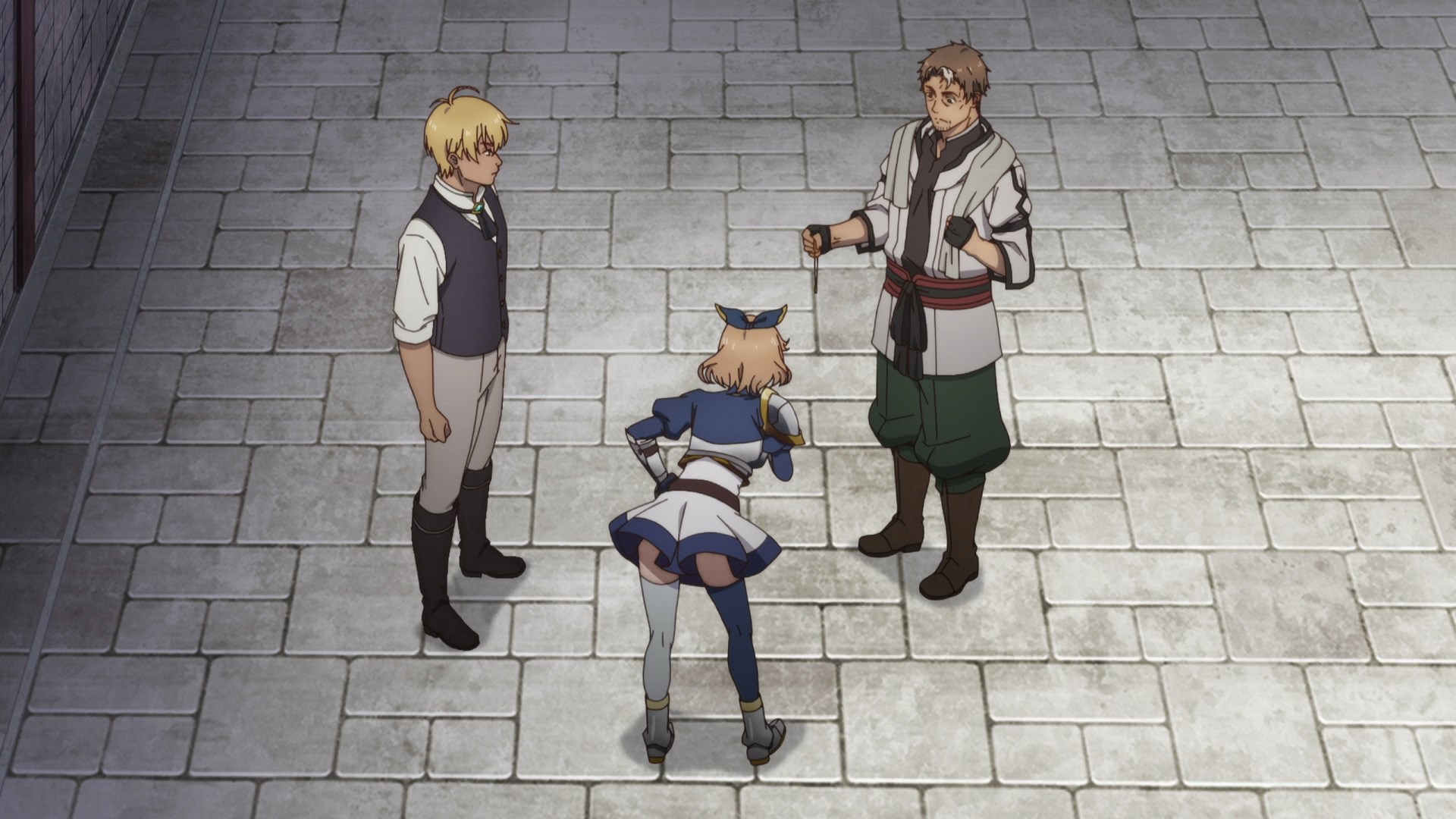 У ГГ-мастера-мечника в жизни было куча учеников, из которых в мульте почти пол дюжины баб сейчас крутятся с ним, но без откровенной тупизны и пошлостей. Мужик за прилавком тоже его ученик. — натянуто, но терпимо.