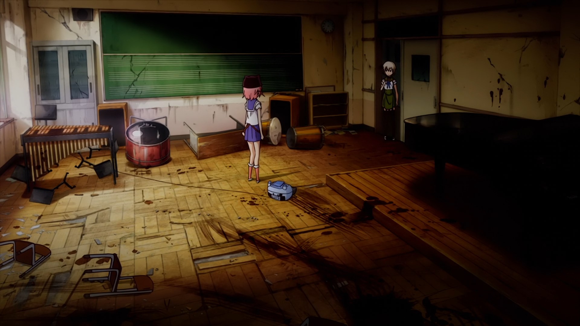 Вы живете в окруженной зомби школе, частично опасной, ваше жилое помещение огорожено кучкой баррикад. Везде срач и говно, все разъебано, какие-то засохшие разводы крови и хлам валяется, стекла выбиты. Все чем вы занимаетесь днями напролет - это подыгрываете поехавшей девочке, имитируя школьную жизнь до катастрофы. Тут бы конечно у кого угодно фляга засвистела.