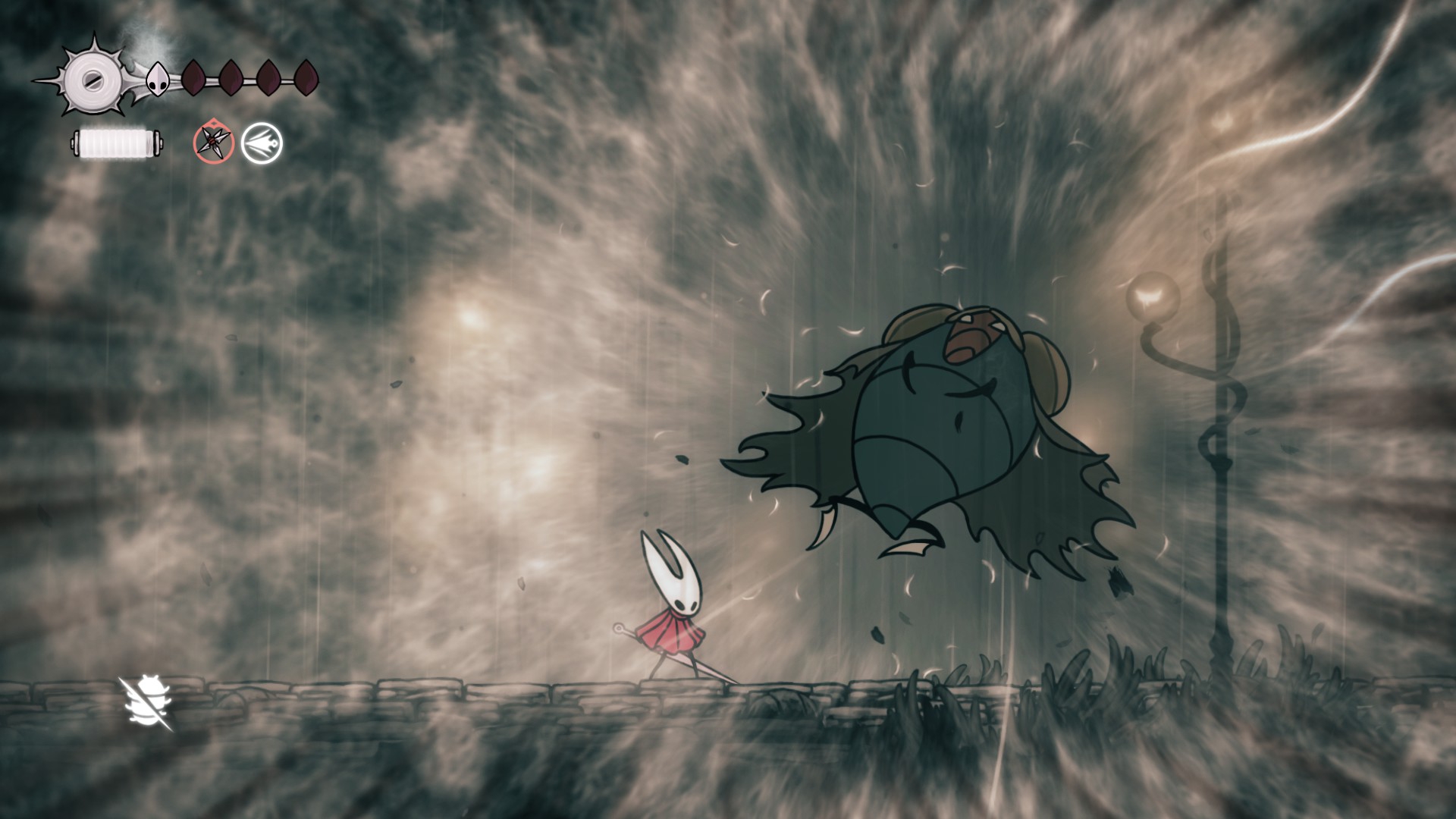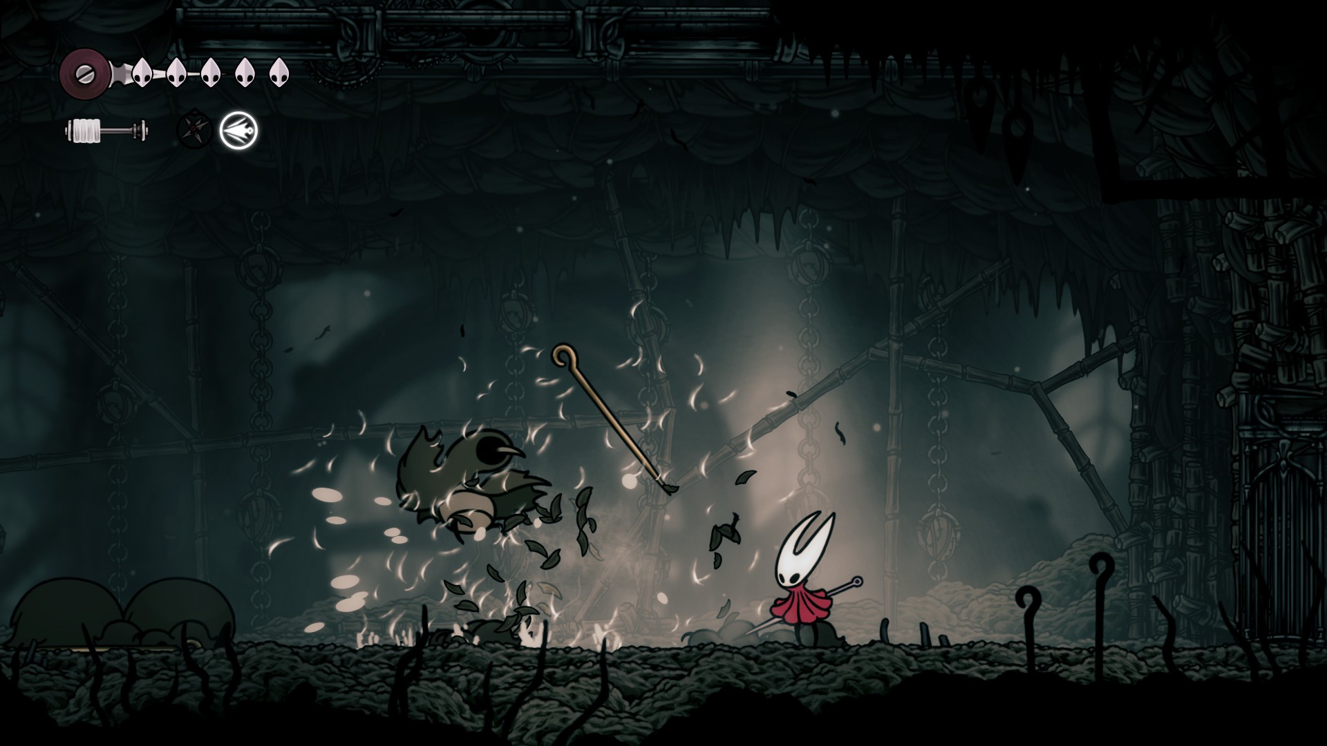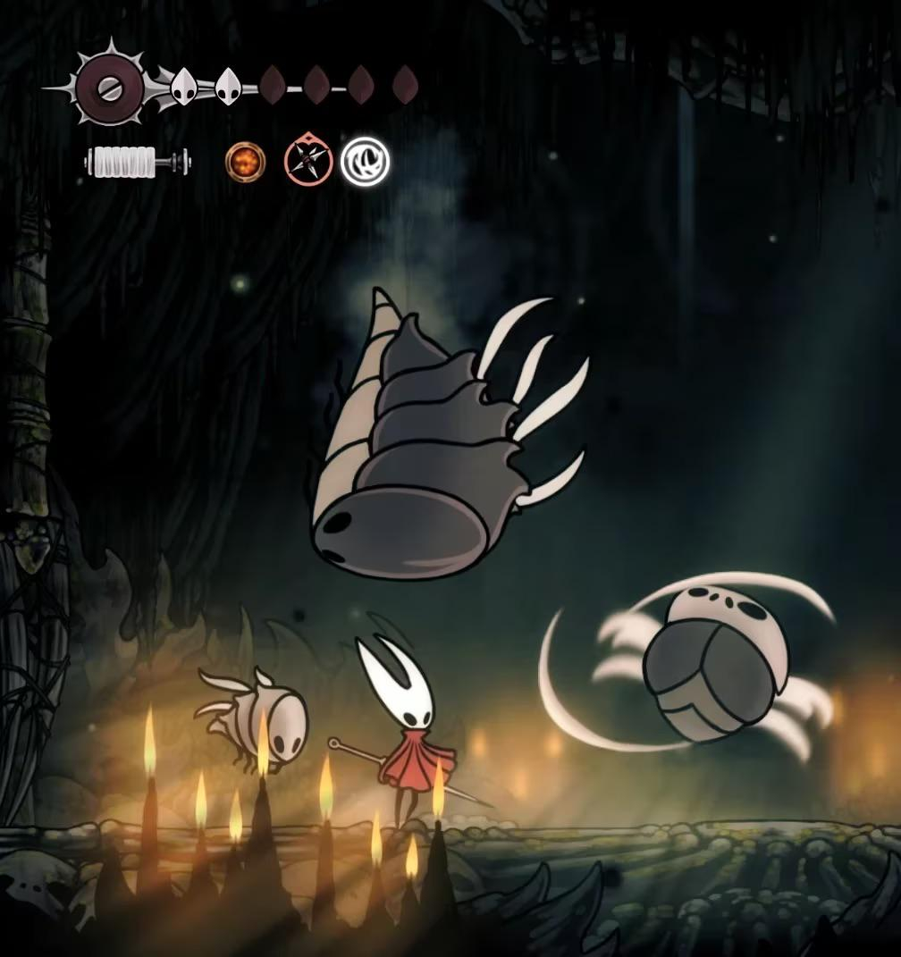 Поднялся на уровень выше, сколько же здесь ублюдского геймдизайна. В первой части все враги имели максимально предсказуемые мувсеты и атаки, здесь им зачем-то доработали интеллект, раздали доджи, долили резкости в мувсеты, ублюдские вейпоинты (вороны перемещаются по параболе блеать и регулярно залезают на высоту откуда ты их даже с прыжком не достаешь), они могут преследовать тебя и перемещаться вертикально, и жир, даже не так, ЗАЖОРИСТОСТЬ в плане хп. Значительная часть из них снимает 2 маски, а со старта игры их всего 5. На локациях щедро насрали аренами, это когда тебя запирают в не очень большой комнате и волнами насылают врагов. Всякие бочки и подножный мусор теперь содержат ловушки и всякие подьебки, чтобы отобрать у тебя и так негустое здоровье. Все это конечно выливается в дебильные смерти и бесконечные траи. Жопка пригорает, но я иду дальше.