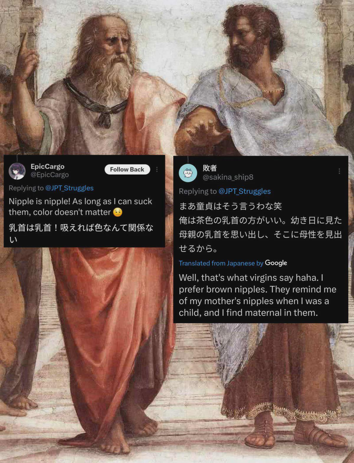>>1097358 Перевод очевидно выбирали в тот момент, когда никто ещё не понимал, что это означает. Поэтому перевели так, чтобы благозвучно было, ну и по смыслу типа подходило. При том, что оно надмозгово должно переводиться примерно как "титан атаки", ведь no относится к первому слову. Watashi no Takaramono - моё сокровище Takaramono no watashi - я сокровища Вот тут то же самое, если совсем примитивно Kyojin no Shingeki - атака титана Shingeki no Kyojin - титан атаки