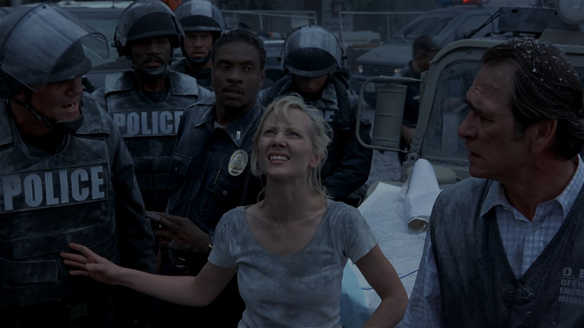 Главные герои спудименсупермен и бетмен глава местного МЧС, глава LA метро, копы и Пожарная охрана города. Такие же мурриканские чуваки, работяги, спасатели, которые через 4 года зайдут в горящий Торговый центр Нью-Йорка. Да даже пиздючке-дочке ГГ 13 лет место нашли, смотреть за ещё более мелкими пиздюками.