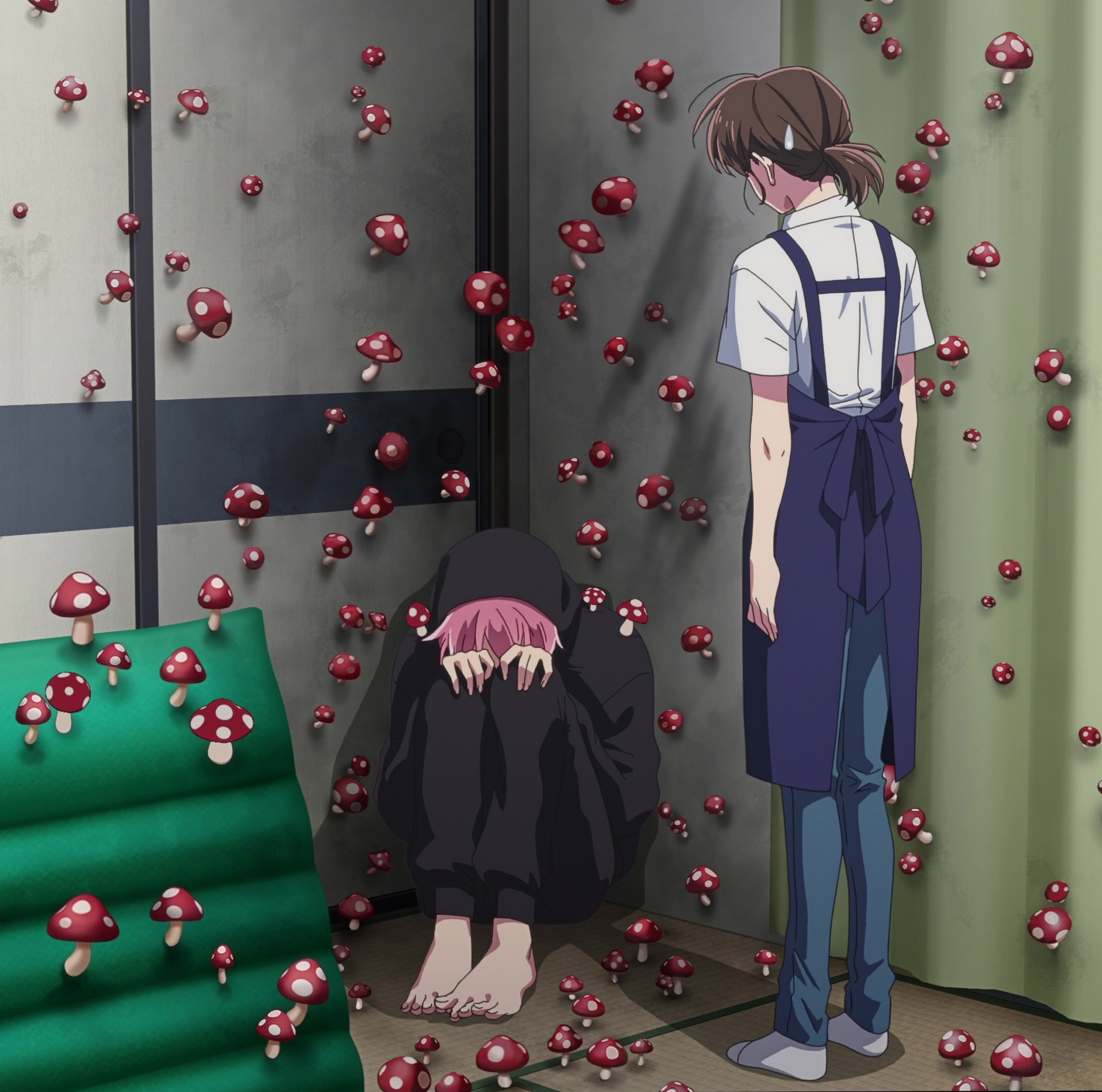 В начале серии хотел написать, что хотя бы драматургия тут хорошо удаётся, несмотря на заунывность действующих лиц, но всё это нытьё во второй половине всё испортило. И вообще арки про косплей почти всегда лютая ебанина. Почему-то аниманга обычно умеет показать любое рандомное увлечение интересным, будь то сёги, готовка, карты, камни или живопись, а с косплеем вечно какая-то хуйня выходит, где персонажи вроде на словах этим горят, а выглядит совершенно безжизненно и натужно. Хотя тут не особо и старались похоже, Кахо тупо раз 5 сказала, что обожает косплей, и на этом всё раскрытие темы окончилось.