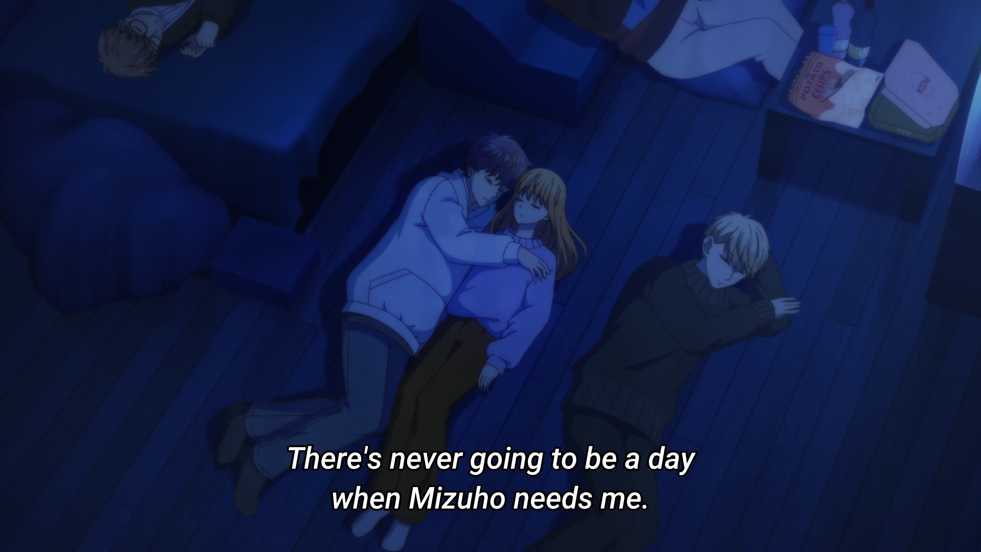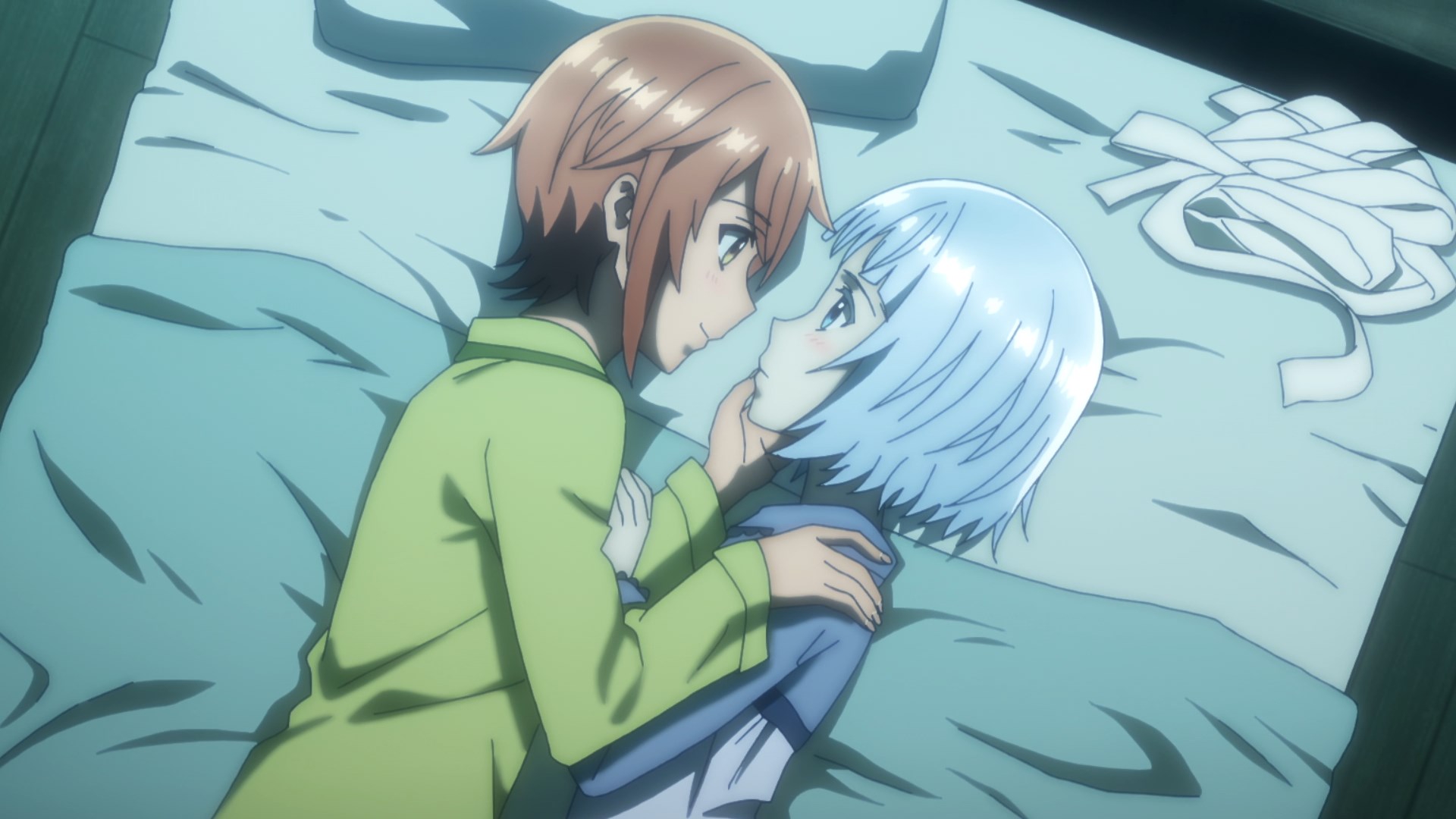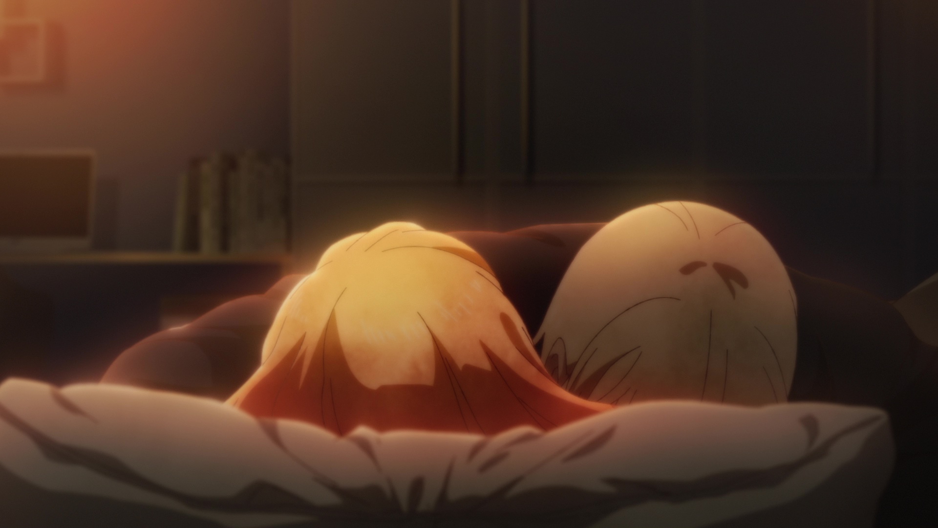 >Физически они находились довольно близко друг к другу. Они были в том же состоянии, что и утром. По всей видимости, они заснули, обнимаясь. >Юки прижала руку к ее голове. Она пробормотала: «…Мы что, влюбленные голубки?»