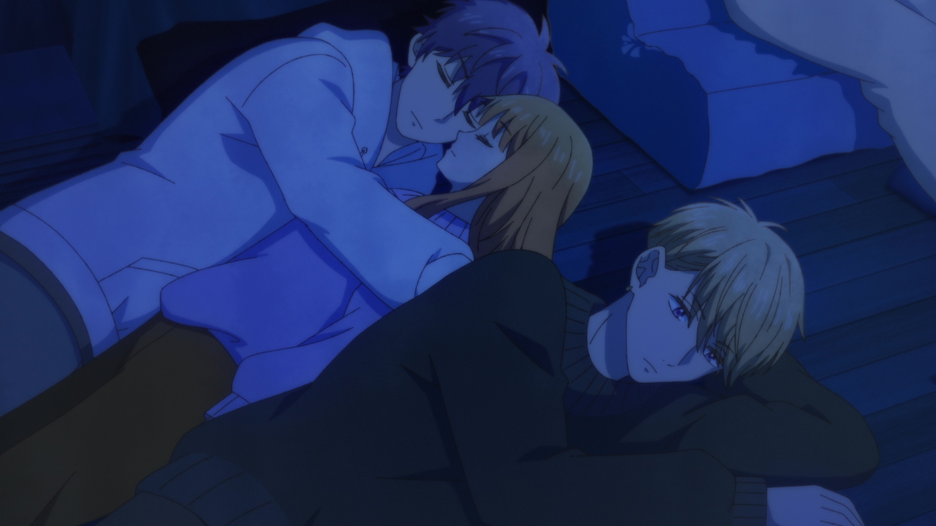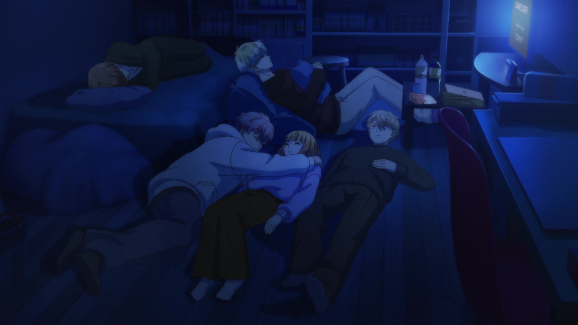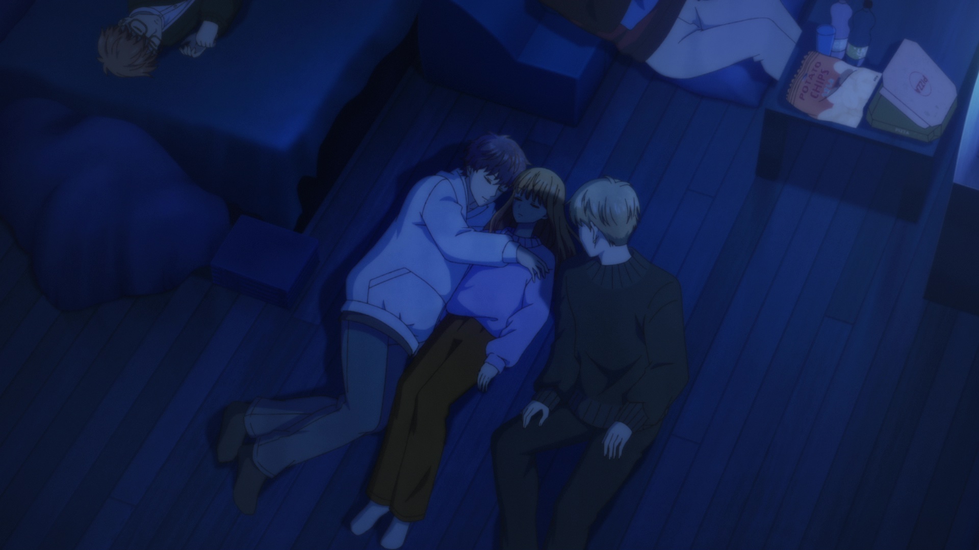 >>1115523 Ну во-первых, на кровати поместятся двое, особенно если девочка с мальчиком. Вон, на полу двое обнимаются, пускай на кровати лежат, а две подушки отдать тем мальчикам, кто на полу.