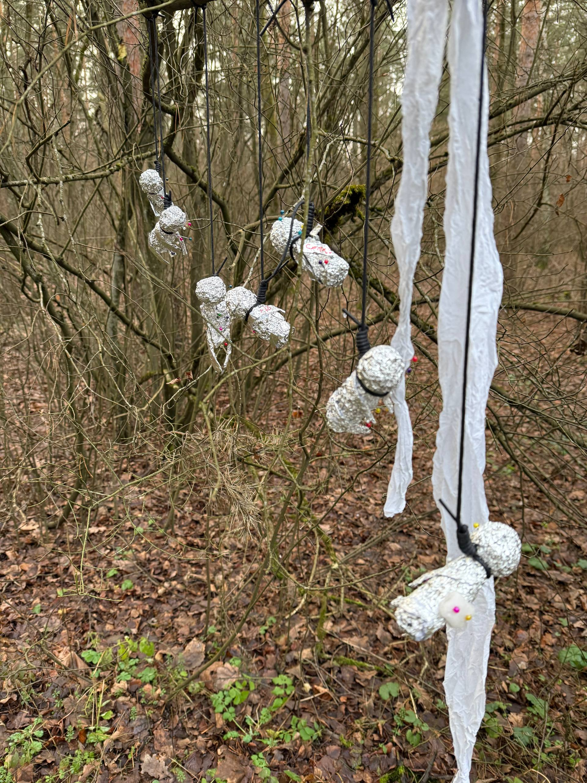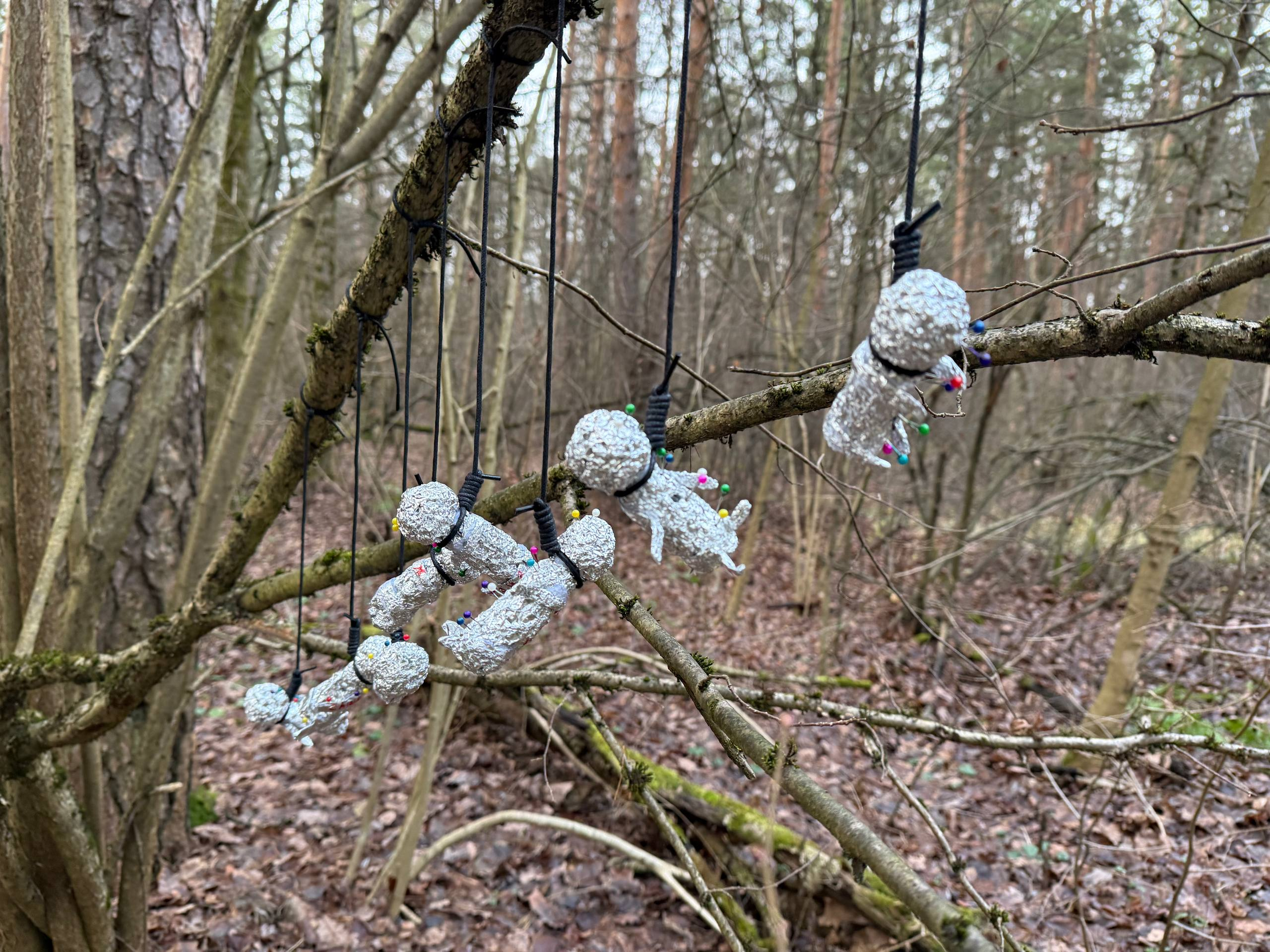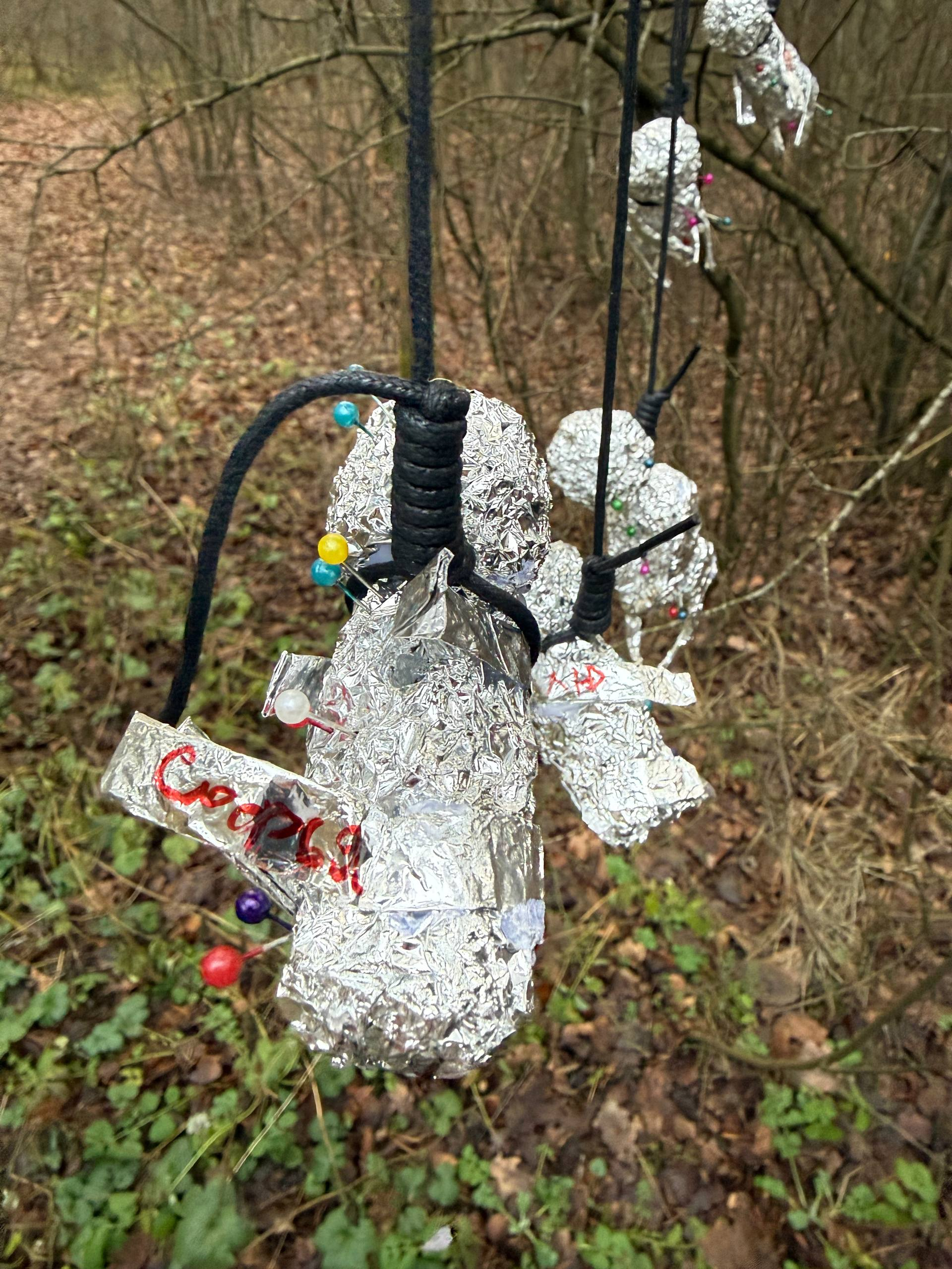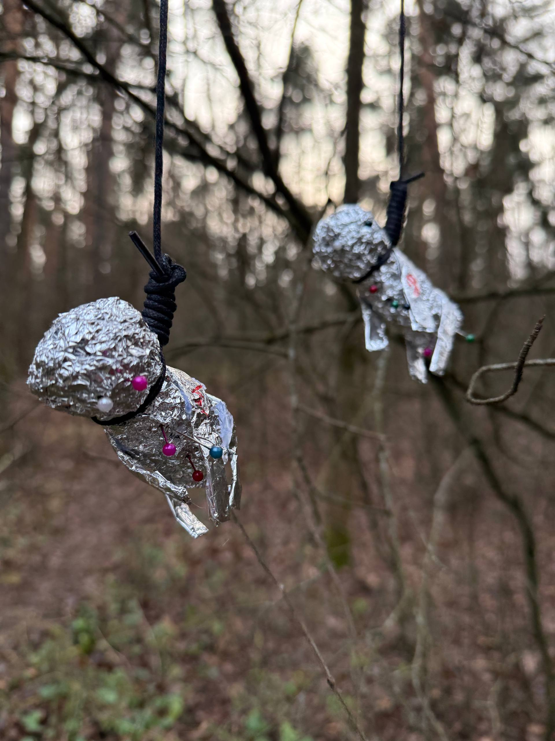 Гулял вчера со знакомым в бору одном, зашли вглубь и со стороны увидели нечто висящее на ветках деревьев, подумали сначала, что может игрушки кто повесил в преддверии снежных дней, а обнаружили подвешенных за шею кукол, сделанных из фольги, в количестве 15 штук, проткнутых иглами, и подписанных именами.