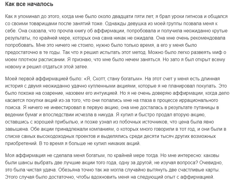 Книгу не читал, но расскажи, как это делать? Для начала нужно выбрать о чем ты мечтаешь. Например, банально, заработать денег. Дальше выбираешь как тебе удобно впихивать аффирмацию в мозг. Можешь писать на листке/печатать в блокноте, проговаривать во время медитаций/про себя, прослушивая на юутбе, etc. И выглядеть это будет вроде того: "Я буду зарабатывать 100к в месяц". Или, если думаешь что вселенная не услышит простое "я", можешь так: "Я имя фамилия, буду встречаться с красивой тян". Главное во время процесса не забывать визуализировать желаемое. Ведь сами по себе эти слова не несут ничего, их предназначение лишь создать ассоциацию, чтобы потом, на автомате, во время проговаривания/записывания/прослушивания сразу всплывал образ желаемого. Так уж устроено наше подсознание, без образов навряд ли что либо пропустит. И делать это желательно минут 5-15, чтобы мозг не слишком уставал, идеально совмещать с медитацией. Затем, через n кол-во времени день/неделя/год, у каждого свое, желаемое начнет исполняться в виде удачи/удачной череды событий, иногда до абсурда удачливой.