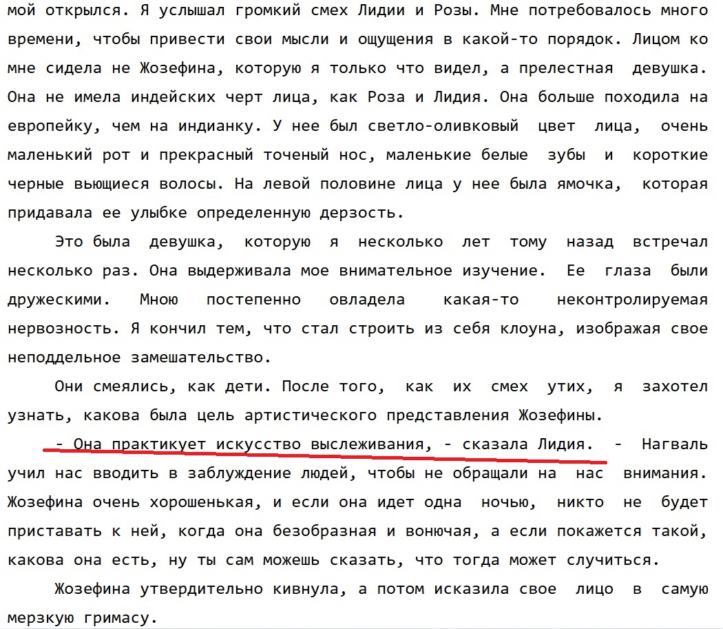 >>685226 Они и по стенам бегать практиковали. То, о чем там говорится не какие-то обычные бытовые вещи, которые нагвалистская тусовка сразу равняет к своему притворству, как то сталкинг = фигней маяться, необычно себя вести, ролеплеить, а то и просто болтать языком. Эмилито говорит Тайше в доме магов - я научу тебя сталкингу с дублем. Причем успешно учит, и за все время обучения Тайша не контактирует ни с какими людьми, сидит на дереве и делает практики. Жозефина и остальные уже могли работать с дублем. Даже бестолковый Паблито попытался ухватить Карлоса рукой своего дубля. И в книге прямо пояснено, что это его сталкинг, так же как давление глазами на грудь Бениньо. Сталкинг это деятельность во втором внимании, которое Жозефина уже могла задействовать по желанию, благодаря тому что это было отработано месяцами практик за годы, проведенные ими с нагвалем. Дубль Жозефины выполнял некую деятельность для нее на постоянке, манипулируя восприятием людей, благодаря которой она могла свободно двигаться, без того чтобы к ней постоянно приставали.