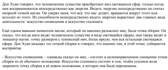 Любое достигнутое состояние не является постоянным. Множество достигнутых позиций точки сборки, над которыми нет полного контроля - это путь магии толтеков. Каждая достигнутая позиция не значит ничего сама по себе.