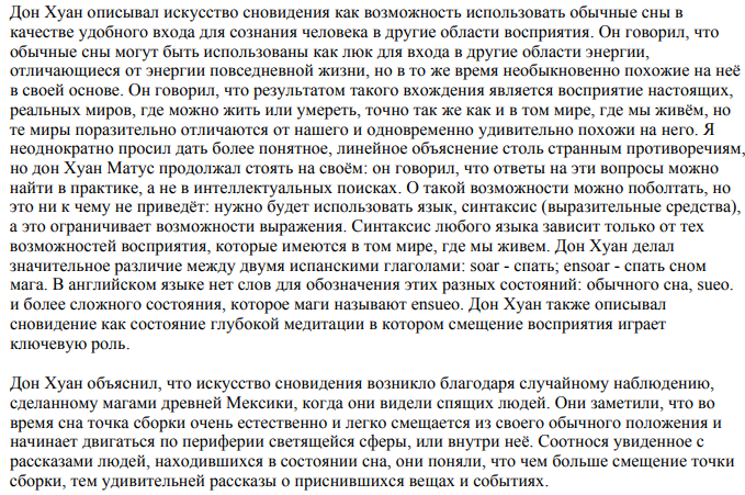 >Сновидение И вот сновидение мне нужно для практики прохождения врат сновидения, тк обычные ОСы в своё время (в детстве) настолько надоели, что я специально перестал в них впадать. А стабилизировать их мир, как описано это в третьей и девятой книге, после чего искать в них аномалии, почти никто не пытается. Но и в этом заложена одна проблема, в ОС может стать скучно, а если ничего не меняется, заскучаешь быстрее. Карлос через перенос в сон всяких красивых природных объектов и залипание в них предлагал решать проблему, как я понимаю.