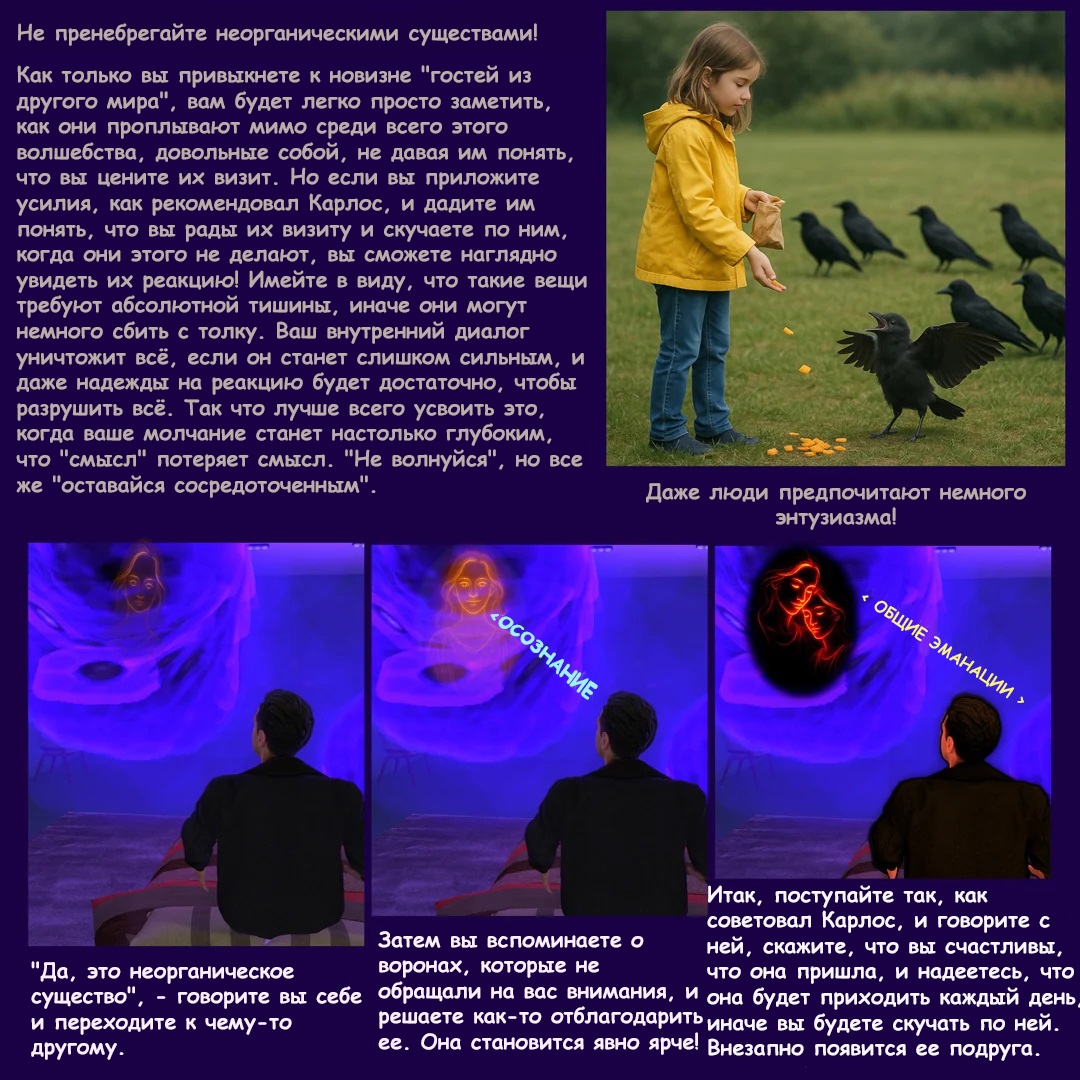 Это для обычного восприятия. По идее, надо в бодрствующем состоянии настраиваться на древние культы через формальное изучение культуры, а в сновидение или даркруме может появиться внезапный гость, в идеале сущность безмолвного знания, которая может надиктовать откровение о скрытом воздействии ритуалов, свойствах растений или что-нибудь совершенно неожиданное... Это очень продвинутый уровень. Мне даже неловко его описывать - у меня очень слабые результаты, только рожицы, фигуры, абстракции, изредка они говорят отдельные фразы, не всегда цензурные. Да и происходит это всего несколько раз за месяц. Такое у всех людей бывает, просто они внимания не обращают.