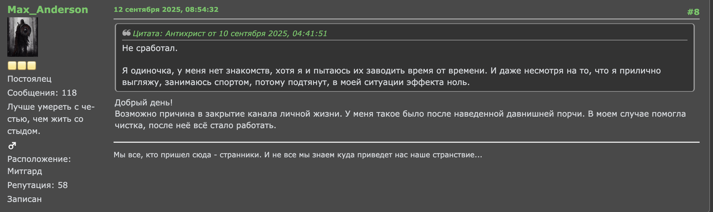 Пожалуй чуть чуть отпишусь. На Чмире - есть все что вам нужно. Главное найдите мастерские работы что откликаются именно вам. Да, вы можете учиться и делать свое, но изначально вы все, как и я ищете результат. Ищите мастерские работы что вам откликаются еще раз. Именно вам. Есть мастера что прост оговор по рунам, а есть мастера что НАСТАИВАЮТ - никакого знания, только рисунок. Я уверен что почитав описания, найдя то что вам нужно, войдя в режим работы по своей задаче, давая ставу 1-2 недели на проявление (а порой некоторые ставы проявляют МОМЕНТАЛЬНО в моменте нанесения) за 2 месяца вы точно найдете мастера чьи работы у вас точно работают. А значит это ваше. Пердолиться с рунами и висами - ваше, рисовать рисунок, обливать его кровищей и забывать - ваше, в зависимости как и что работает. Ничего не хочу говорить, но скажу одно - РУНЫ это не просто мощь, это то что должен делать ТЫ САМ, никто за тебя не сделает, и результат превосходит ЛЮБЫХ колдунов/магов за ЛЮБЫЕ деньги. А я и платил было дело.Каждый раз когда они срабатывают ты будешь понимать что мир.. это нихуя не то что ты думаешь. В этом возможно цена. Может у тебя будет другая. Из просто посоветовать могу сказать что очень крутые - Вяземский, Иннер, Ловушка. Но опять - откликнутся их работы именно тебе анон или нет - неизвестно, у меня СЭМ работает только одна формула и на чуть ниже среднего силе, у когото ни одной, у кого то все, у когото та же что и у меня но на высочайшей мощности. Ищи мастеров чьи работы будут у тебя откликаться и работать.