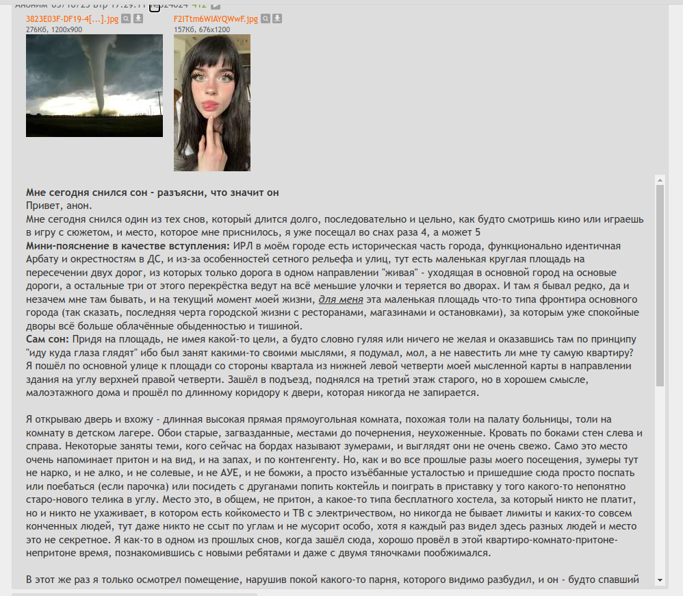 Магач, помоги разобраться. Не знаю, в какую тему посылать, но кину сюда. Я чел с богатым воображением, и сны снятся всегда яркие, зачастую осознанные. И во снах у меня происходит много движа, отчасти потому что в ирл я чаще всего "сплю" и нахожусь в оцепенении. То есть основная моя жизнь начинается только когда я засыпаю, но щас не об этом. Короче, я легко отделяю хуйню от не-хуйни, то бишь, когда мне снится переработанный мозгом за неделю-месяц мусор, я это прекрасно понимаю. А когда прилетает ценная инфа, то от сна совсем другие ощущения. И стало мне где-то полтора года назад сниться кое-что. Опущу подробности, но демон страхоёбищный кланяется мне такой и говорит: ты король демонов, мы тебе служим. Я проснулся, посмеялся: топорная хуйня, а чё сразу не король вселенной? А потом стало не до смеха, когда сны с подобным нарративом стали сниться регулярно. Ну я репу почесал, потревожился, пошёл в церковь, помолился, хуе-моё, а потом набрал святой воды и почистил помещение, в котором живу. Я не воцерквлённый, и логика была такая: снятся демоны, соблазняют на что-то – проще попросить защиты у ХЭ (Я крещёный). И вот после посещения церкви и чистки меня ебашнуло в первый раз – не сильно, но ощутимо, как будто кто-то навесил мне мешки на плечи. Провёл обессиленный в постели сутки, потом полегчало. А теперь расскажу один сон подробнее. Приснилось мне, что я колдун. И тут в моей деревне начала происходить всякая фигня, из-за чего все ополчишись на меня, единственного практикующего в их общине. А я не виновен! Ну и я, чтобы спасти жизнь свою, применил все свои способности ОС: быстро бегал, летал по небу от самолётов, и никто не мог меня достать. Пока к горожанам не вышел... православный батюшка. Ну знаете, такой в чёрной робе, с бородой, но накаченный, как Шварц и метра два ростом. Шкаф, короче. И он начал за мной гоняться, по земле, естественно. И да, он за мной паркурил и бегал как Наруто. И именно тогда я стал понимать, как сильно устаю от погони. Хватило меня буквально на пару минут, и потом пришлось сдаться. Он меня в наручники и ведёт куда-то. Я, естественно, в ахуе и проигрываю в голосину, говорю: "Блять, серьёзно? Поп-паркурщик? Меня поймал ебаный поп-паркурщик??" На что батюшка чуть ли не краснеет как аниме-девка и говорит смущенно: "Нас этому обучают". А я смотрю вперёд и вижу, как меня в церковь ведут. После этого сна ещё частенько было такое, что снова снились какие-то тёмные, но уже не так охотно. Хотя недавно увидел такую картину, что меня вообще через зеркало в силы посвятили, а я как бы и не в курсе. Никогда не думал и не хотел связываться с чем-то тёмным, да и по натуре я человек добрый, мне претит любая идея работать через бесов и прочее. Или это во мне говорит ХЭ? Этот безотчетный страх и отвращение к тёмным уже давно вызывают во мне вопросы. Может кто мне поможет найти ответы? Если кто-то добрый найдётся, можем в тг поговорить.