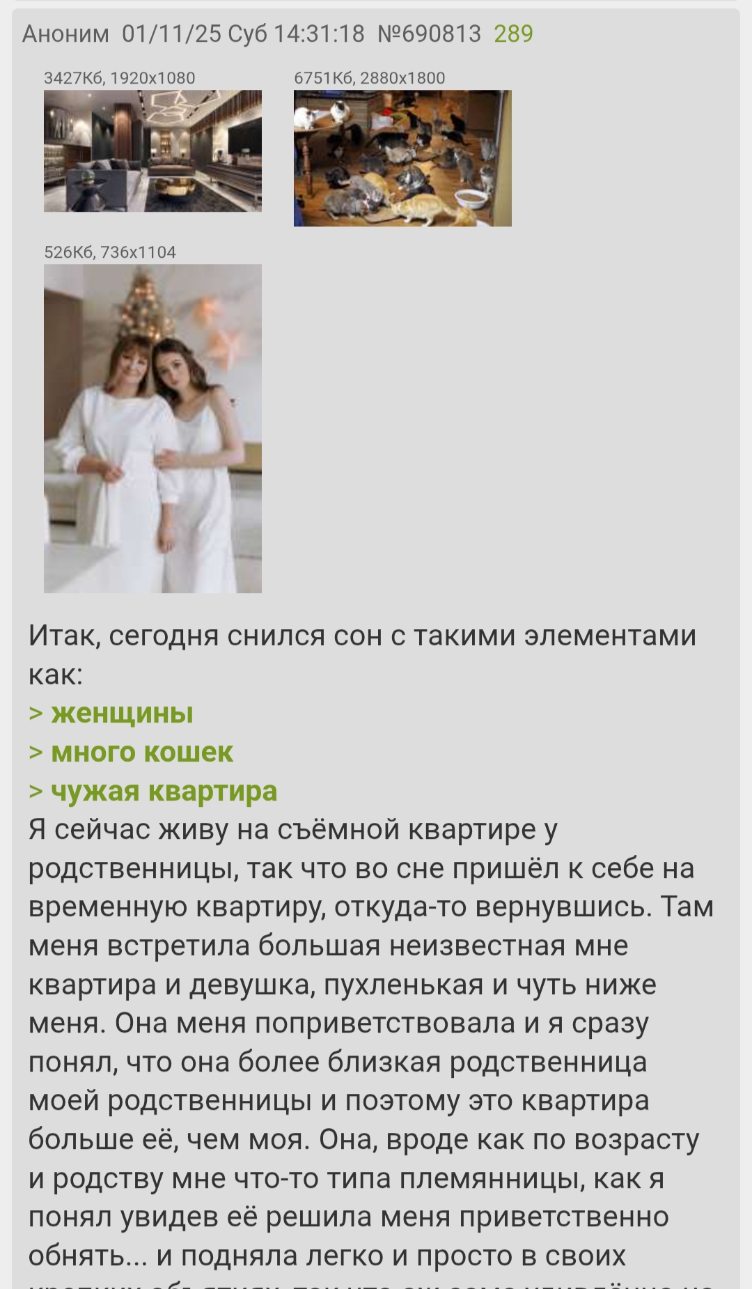Итак, сегодня снился сон с такими элементами как: > женщины > много кошек > чужая квартира Я сейчас живу на съёмной квартире у родственницы, так что во сне пришёл к себе на временную квартиру, откуда-то вернувшись. Там меня встретила большая неизвестная мне квартира и девушка, пухленькая и чуть ниже меня. Она меня поприветствовала и я сразу понял, что она более близкая родственница моей родственницы и поэтому это квартира больше её, чем моя. Она, вроде как по возрасту и родству мне что-то типа племянницы, как я понял увидев её решила меня приветственно обнять... и подняла легко и просто в своих крепких объятиях, так что аж сама удивлённо на меня посмотрела - неожиданно было для неё поднять меня так легко, и я такого не ожидал ни от её силы, ни от своего веса. Дальше разулся и прошёл дальше в квартиру и там было очень много кошек, они все выстраивались в ряд по обе руки и я их гладил оптом, сразу несколько кошек за один присест. Однако, все эти кошки появились только там и только тогда, когда я был проходя ту конкретную комнатушку или коридор. Потом где-то в комнатах я столкнулся с ещё одной девушкой, которая поздоровалась, обняла сильную тянку из начала сна бочком (так, чтобы обе смотрели на меня и были повёрнуты ко мне), и немножко рассказала ЛОР сна, мол, она более худая и чуть-чуть пониже ростом, чем та сильная девушка при входе, на самом деле мать той девочки, что было не видно по её лицу - как по мне, они были более менее одного возраста Какие образы почерпнул из сна: 1) многокошие 2) квартира была большая, на много-много комнат, не сказать что новая и по последнему писку моды дизайна интерьера, но чувствовалось,что квартира сделана со вкусом, просто но богато 3) две молодые женщины родственницы Что сон сулит? На что намекает? О чём говорит?