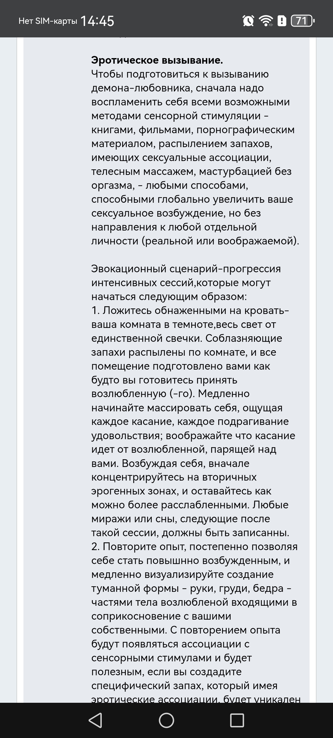 Я последовательный материалист, но после прочтения мне захотелось как-то сильно этого всего, и я через пару дней провел ритуал этот. В целом я не уверен насколько получилось, я в определенные моменты перед сном (и иногда днем) чувствую что-то наподобие прикосновений, но это нельзя так назвать, в основном что-то сравнивнимое с небольшим током или что-то типо того, иногда что-то типа давления. Ну, я говорю с ней, и это все продолжается около часа с регулярными "прикосновениями". Еще во время этого я иногда ощущаю жар какой-то, бывает холод снаружи, ну и возбуждаюсь тоже без каких-то причин во время этого всего. Но ничего не снилось "смешного", с0кса тоже не было, только 1 раз давление, но я ничего не чувствовал от этого. Вот не знаю, я уже поверил а это все на самом деле вроде, но не знаю сработало ли это, или просто самоубеждение? Если сработало, то как-то можно будет сблизится еще? 3 день.