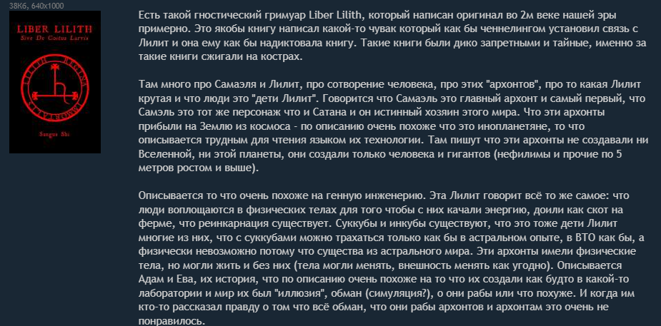 >>683090 Да, не читал дневник. Он отношался с Лилит, а не с суккубой. Как бы это сильно не одно и то же. Но почитать наверно таки стоит. >>683091 >Liber Lilith это художественная литература Не художественная, а написанная им. Как бы это сильно не одно и то же. LL - это компиляция в удобоваримой форме. Библию читал? Синодальный перевод - написан как курица лапой, далеко не просто от "приятного" чтения, далеко даже от нормального изложения. А Тайсону спасибо. Постарался для нас, болезных. Переводчику отдельная благодарность!