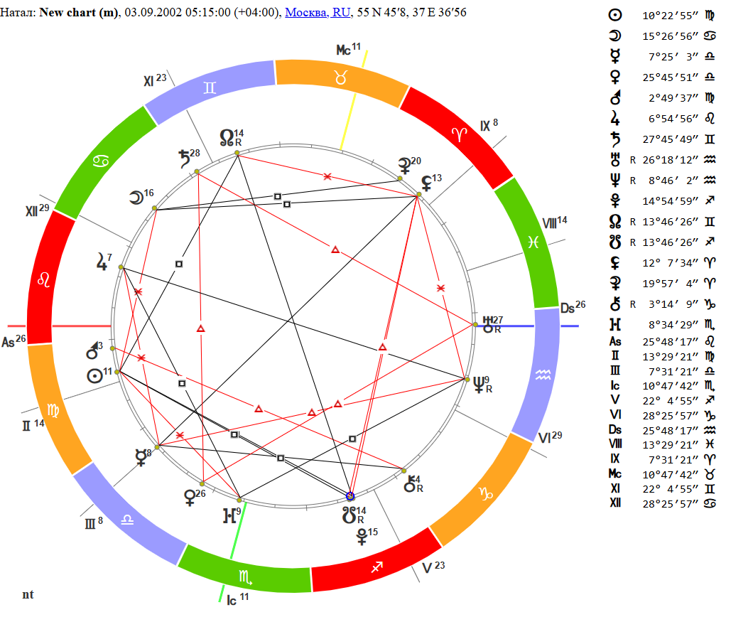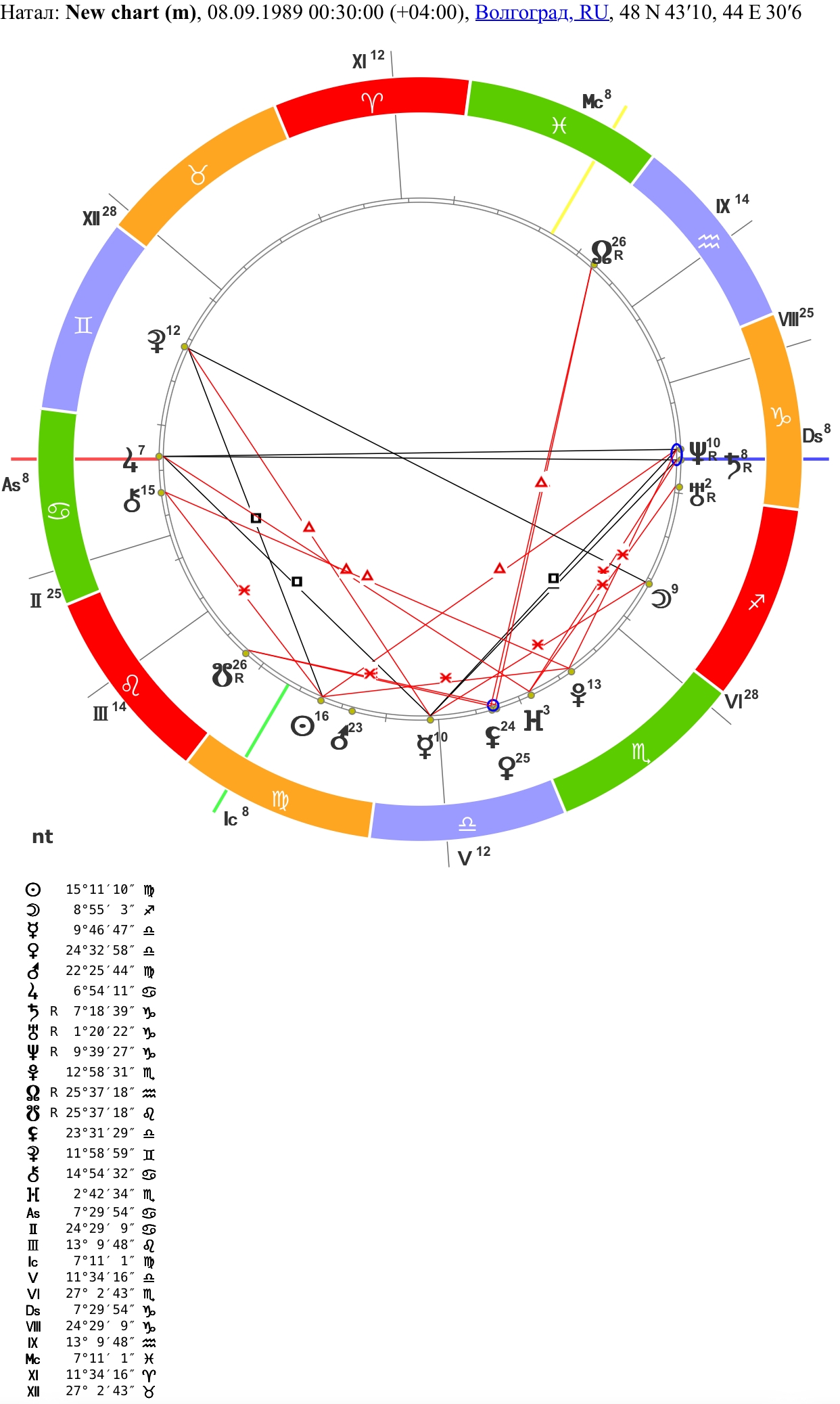 Приветствую аноны, будьте добры разберите карту. Пол мужской, время со слов матери близко к точному, на бирке при рождении стояло оно. Хотелось бы узнать расшифровку в целом, но уделить внимание стороне личных отношений и творческим способностям. Либидо сильное, девушек в жизни было много, но 90% из них если не больше это случайные, краткосрочные связи. Всё что было с серьезным подтекстом заканчивалось не в мою пользу от слова совсем, и переносил это всегда плохо. Не пойму что делаю не так, когда пытаюсь наконец-то остановить всё на одном человеке всё рушится. В плане творчества, есть кое что чем планирую заняться, но не могу никак решится, хотя периодически нахожу подтверждения того что у меня есть к этому способности, возможно даже очень сильные способности. Хотелось бы разобрать эту сферу.