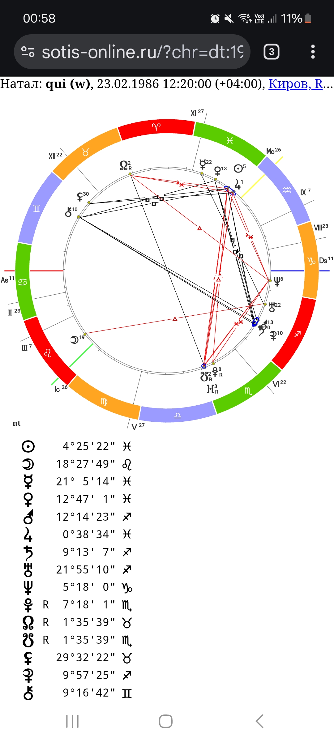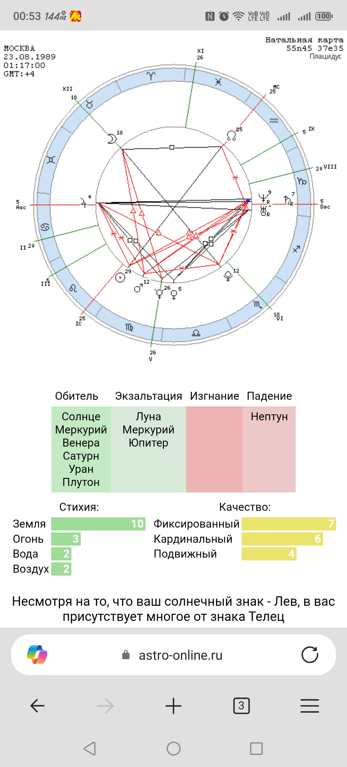 И в плане возраста угадал. А скажи еще че-нить. Просто прикольно послушать как по какой-то непонятной, для меня(пока еще въезжаю в эту тему и вот так читать наталки не умею), картинке незнакомый чувак угадывает какой-нить нюанс точно)) Пока не женат, да. В последних отношениях жоска на эмоциях прокатился и был уверен, что женюсь, но вселенная отвела и как показало время - к лучшему. Но я ёбаный козерог, реально дохуя думаю, и че с самого начала подмечал, то что не нарвилось, то и станвоилось, в итоге, точкой начала конца. А ты по какой книге или сайту, каналу учил читать наталки?