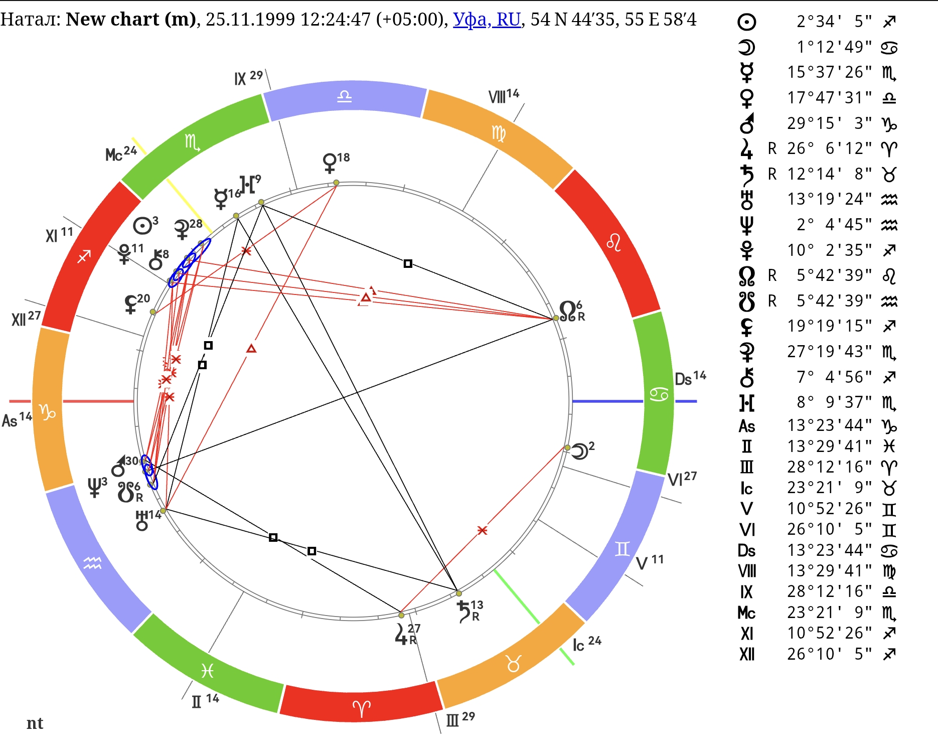Привет, хотел бы разбор наталки, пожалуйста. Особенно интересует тема отношений. Никак не получается построить нормальные долгосрочные отношения. То измены (не с моей стороны) , то просто бросают. Редко к кому удаётся что-то почувствовать вообще. Также карьере и здоровью тоже было бы интересно услышать. Карьера относительно стабильная, работаю в одной сфере, но выходить на высокий доход не получается, вечно не хватает денег, в следствии чего стагнация и невозможность достигать каких-то целей.