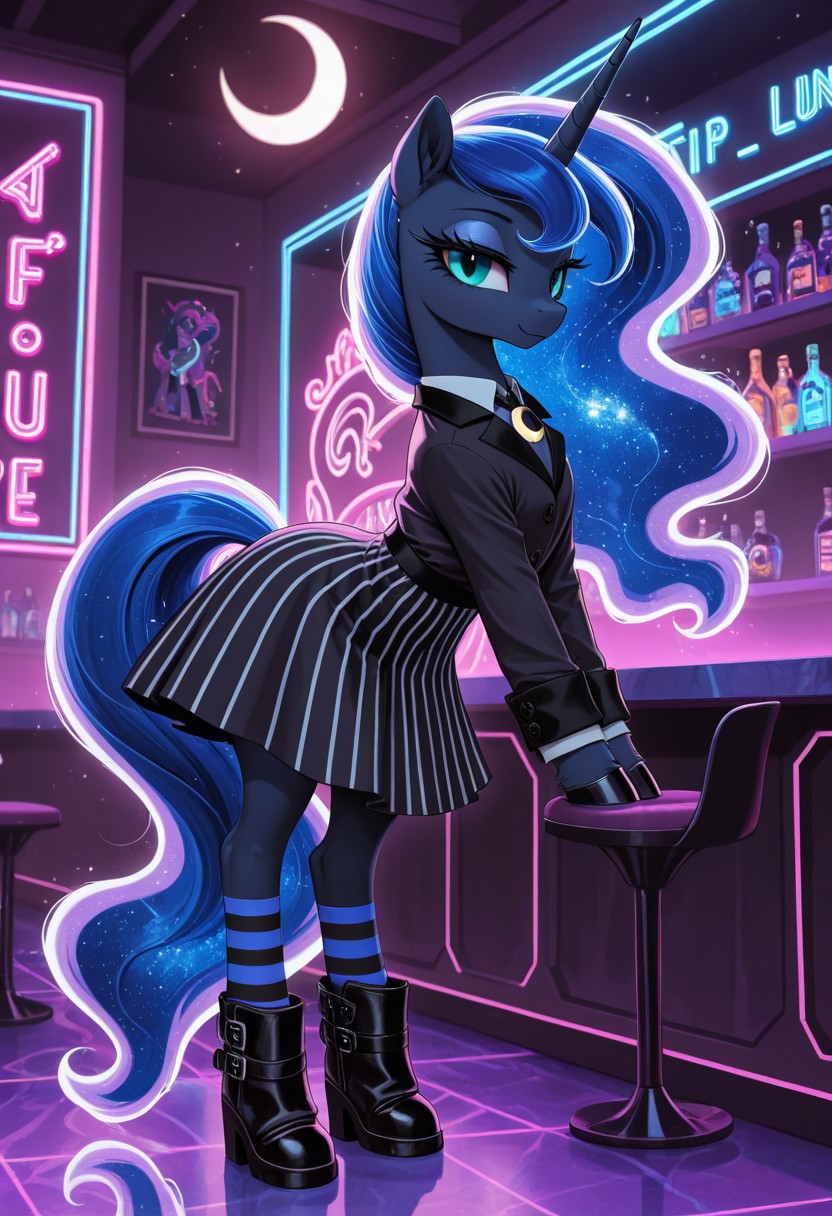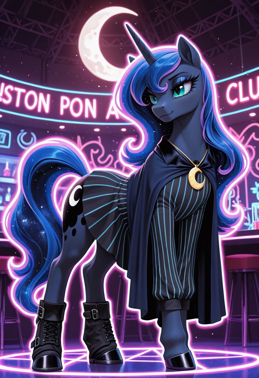 Лунная пони — аликорн. Ростом и пропорциями идентична принцессе Селестии, имеет чёрный окрас, синюю эфирную гриву с фиолетовым призрачным обрамлением.Носит светлую металлическую защиту на копытах, груди и голове.