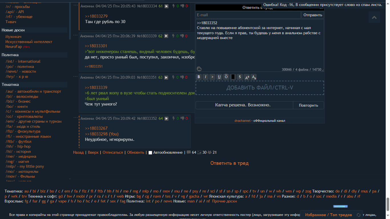 >>4416606 Это я запустил ботоферму по новой, теперь тред оживится ещё на постов 100 и потом снова перезагрузится. Чувствуешь как капча лагает? Вот и думай.