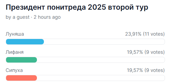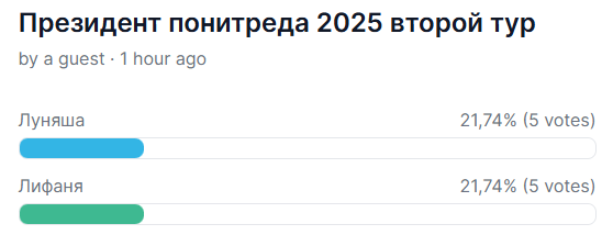 >>4417528 Все уже закончилось. Победила Луня.Всем похуй на голосование.