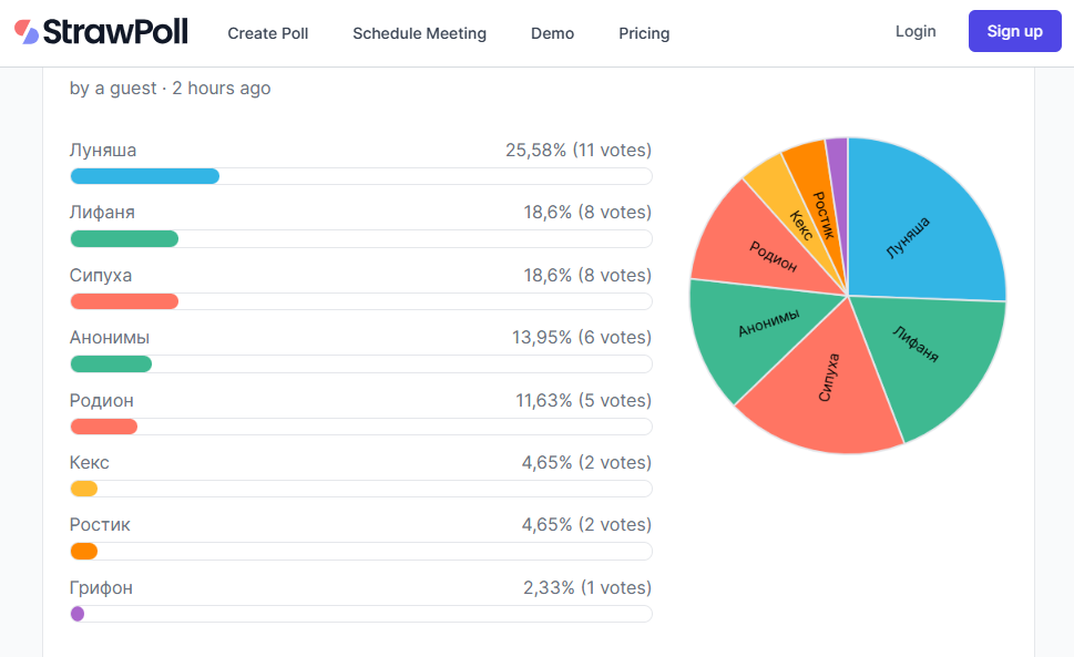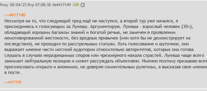У сирухи было 2 голоса ровно до того момента пока я не написал в треде голосовать за сируху. Цветочный это увидел и побежал айпишники менять трясущимися ручками чтобы все решили что это я или сируха крутит, но мы уважаемые пони а цветочный скуфидон воняет смертью тем не менее, от всевидящего меня тебе не спрятаться гомункул