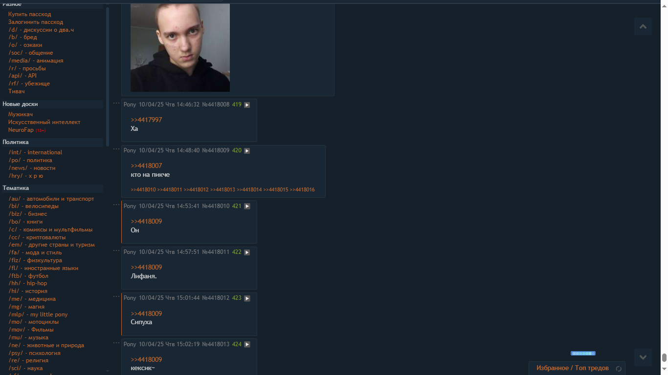 >>4417672 За молочком? За зефирчиком? >>4417671 Сипуха обосрался, Лифаня обосрался, оба накручивали. Сипуха с новым трипом изображал из себя пожилую женщину, выбирали нового "лидера", а я устал, я мухожук. "Выбрали" Луньку, а я хотел чтобы выбрали Родю, было бы забавнее. Короче опять ничего нового, только старые срачи. >>4417674 Докажи.