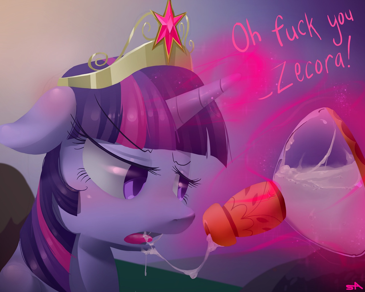 И в этот момент, с безумным блеском в глазах, вы достаете бутылку прохладного сидра, который так любят пони. Вы прикасаетесь к её губам бутылкой, позволяя ей почувствовать холод стекла.
