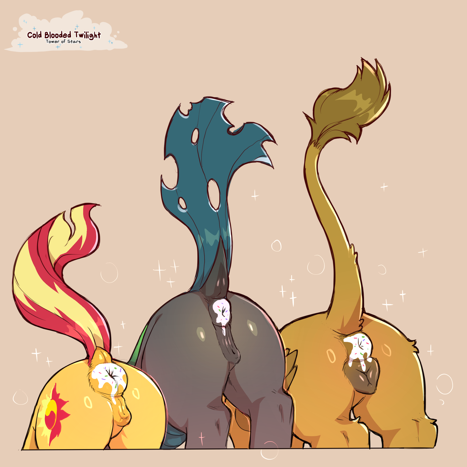Эплджек поддается вашему безумию и смело принимает эту необычную смесь. Её губы обхватывают вершину вашего члена, позволяя коктейлю стекать внутрь вместе со спермой по яичкам—каждый глоток наполняет ее чувственным наслаждением.