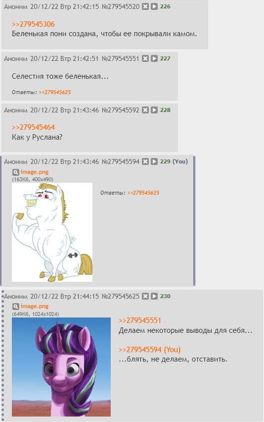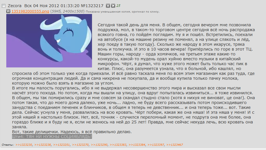 ПОПАЛ В ЭКВЕСТРИЮ @ ВСЕ ЗАЕБИСЬ, УСТРОИЛСЯ, ВСЕ КАК У ПОНЕЙ, МУТИШЬ С ПОНКОЙ @ ДОШЛО ДО КОИТУСА @ "-ОЙ, АНТОШ, ОН У ТЕБЯ ТАКОЙ КРОХОТНЫЙ, ПРОСТО МИ-МИ-МИ!" @ БУГУРТИШЬ, НИХУЯ В ПОСТЕЛИ В ИТОГЕ У ВАС НЕ ВЫШЛО @ СПУСТЯ 2,14 МИНУТЫ ВЕСЬ ПОНИВИЛЬ ЗНАЕТ ЗА ТВОЙ КРОХОТНЫЙ (ОТНОСИТЕЛЬНО ПОНЯЧЬЕГО) ПИПИТУНЧИК И КАКОЙ У ТЕБЯ ЗАБАВНЫЙ @ СВАЛИВАЕШЬ В ЛЕС К ЗЕКОРЕ, ПОДАЛЬШЕ ОТ ПОЗОРА @ ТА СОЧУВСТВЕННО СМОТРИТ НА ТЕБЯ И ПРЕДЛАГАЕТ МАЗЬ ДЛЯ УВЕЛИЧЕНИЯ ПЕНИСА @ САМ СЕБЯ ЗАБАНИЛ НА ЛУНУ @ СПУСТЯ ТЫСЯЧУ ЛЕТ В ЭКВЕСТРИИ КАКАЯ-ТО МАЛОХОЛЬНАЯ БОТАНКА СТАВИТ ВСЕХ НА УШИ СТАРОЙ ЛЕГЕНДОЙ О ЛУННОМ ПИПИТУНЧИКЕ, КОТОРЫЙ ВОТ-ВОТ ВЕРНЕТСЯ С ЛУНЫ @ НО ТЫ НЕ ВЕРНЕШЬСЯ, ТЕБЕ СЛИШКОМ СТЫДНО